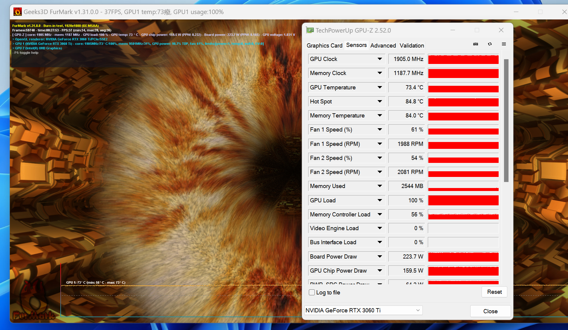 顯卡GPU核心頻率1905左右,溫度73.4, 功耗223W左右。