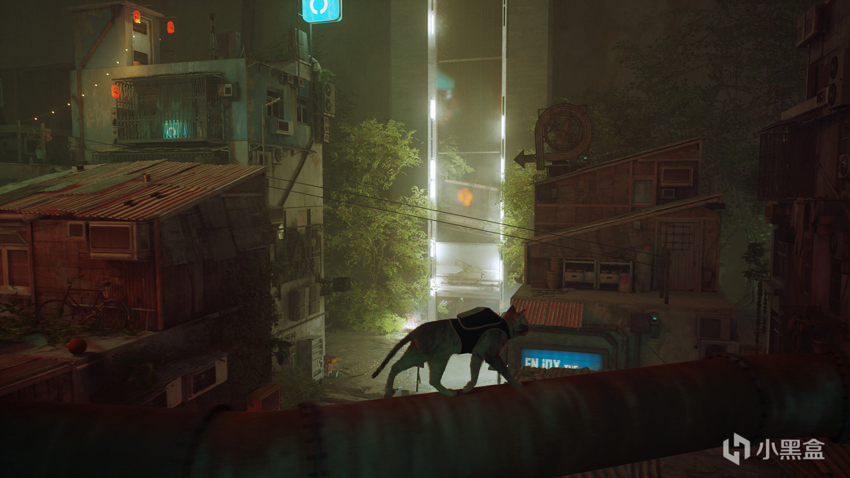 因爲主角是一隻貓咪,在縱橫交錯高低不一的建築羣中,上躥下跳是理所當然的,但是不能完全把它當成流浪貓模擬器來玩,單一跳躍帶來的自由度是有限的,爲了增加貓咪玩法的趣味性,還會結合了一些闖關,比如說躲避紅外陷阱,用電子鎖困住衛兵機器人、繞圈圈躲避菌克等待升降機、B-12無人機互動玩法等,這款遊戲也有一些顯淺的解密元素,畢竟它實質上是屬於冒險類遊戲。