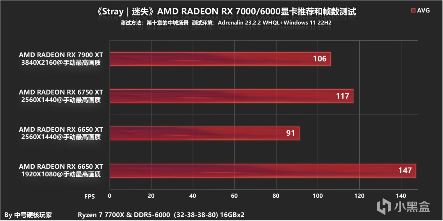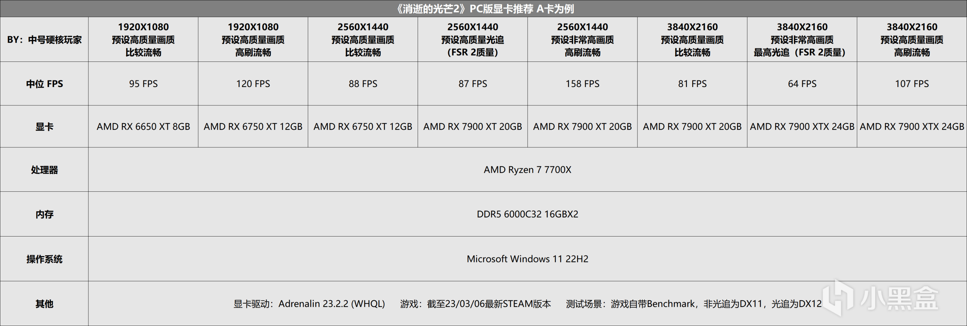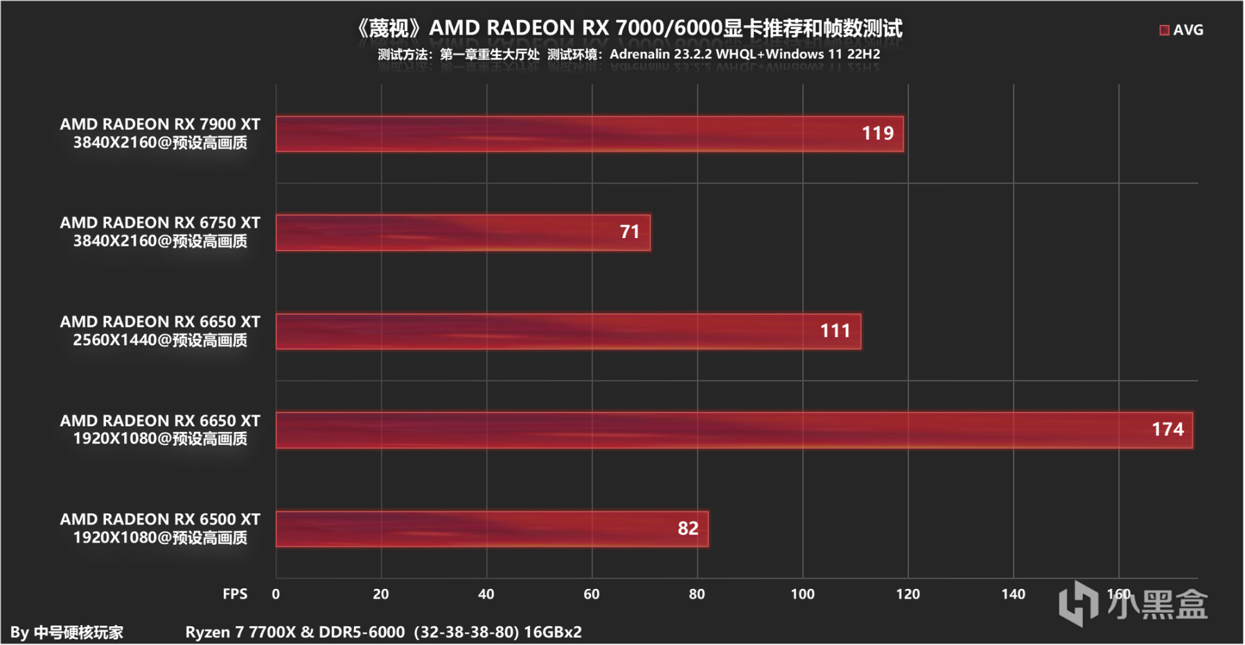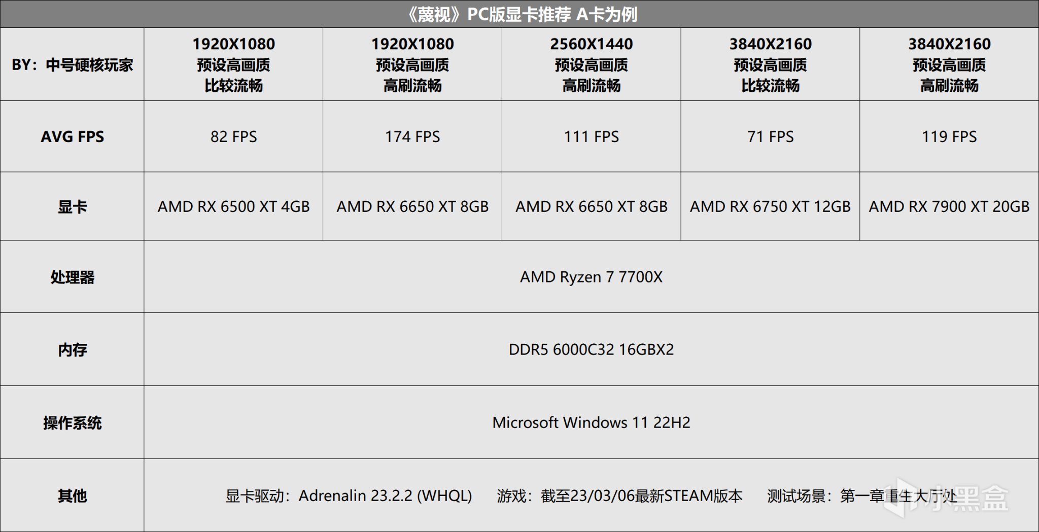 本次測試安裝Adrenalin 23.2.2(WHQL)的顯卡驅動(23年2月23日更新),操作系統是Windows 11 22H2最新版本,處理器是Ryzen 7 7700X是默認PBO AUTO狀態(對於本次挑選的遊戲,一般千元主流級處理器即可滿足),搭配兩根DDR5 6000C32 16GBX2組成雙通道內存,並在BIOS中開啓SAM技術提升一些顯卡性能,測試結果除了光追設置以外不會涉及到FSR技術,因爲這樣纔是最好的保底方案。