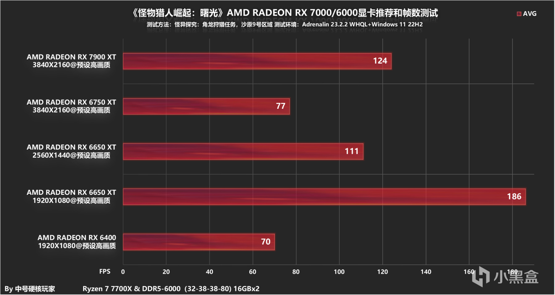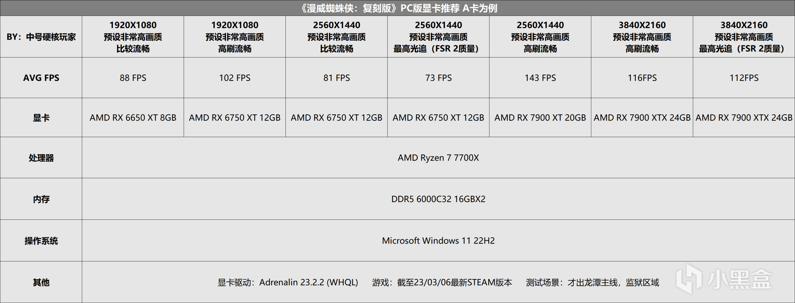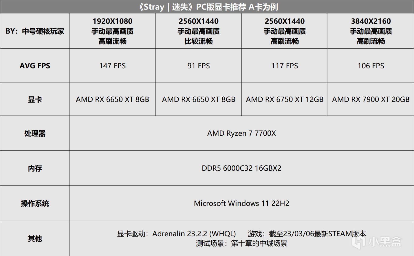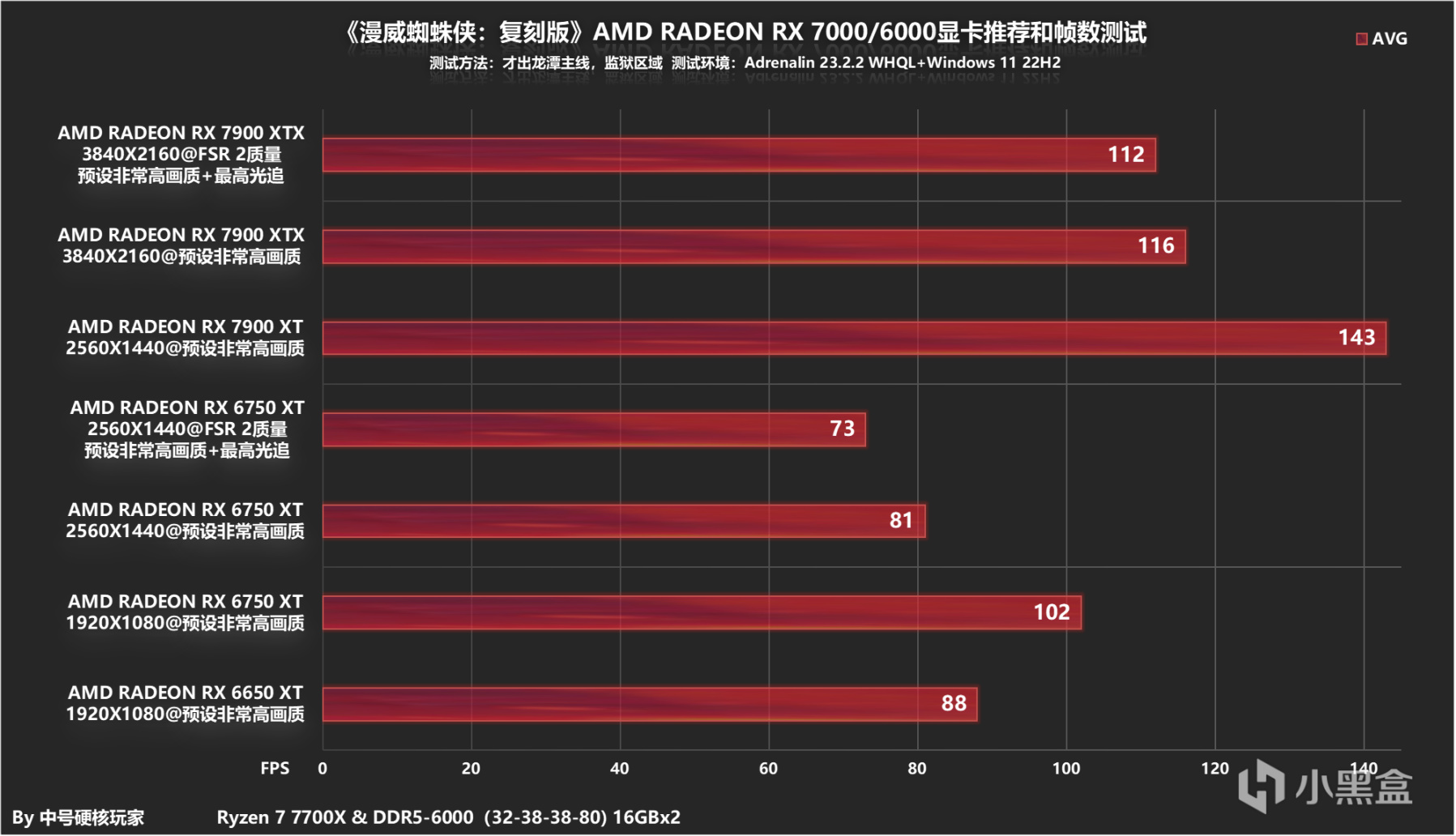 本次測試安裝Adrenalin 23.2.2(WHQL)的顯卡驅動(23年2月23日更新),操作系統是Windows 11 22H2最新版本,處理器是Ryzen 7 7700X是默認PBO AUTO狀態(對於本次挑選的遊戲,一般千元主流級處理器即可滿足),搭配兩根DDR5 6000C32 16GBX2組成雙通道內存,並在BIOS中開啓SAM技術提升一些顯卡性能,測試結果除了光追設置以外不會涉及到FSR技術,因爲這樣纔是最好的保底方案。