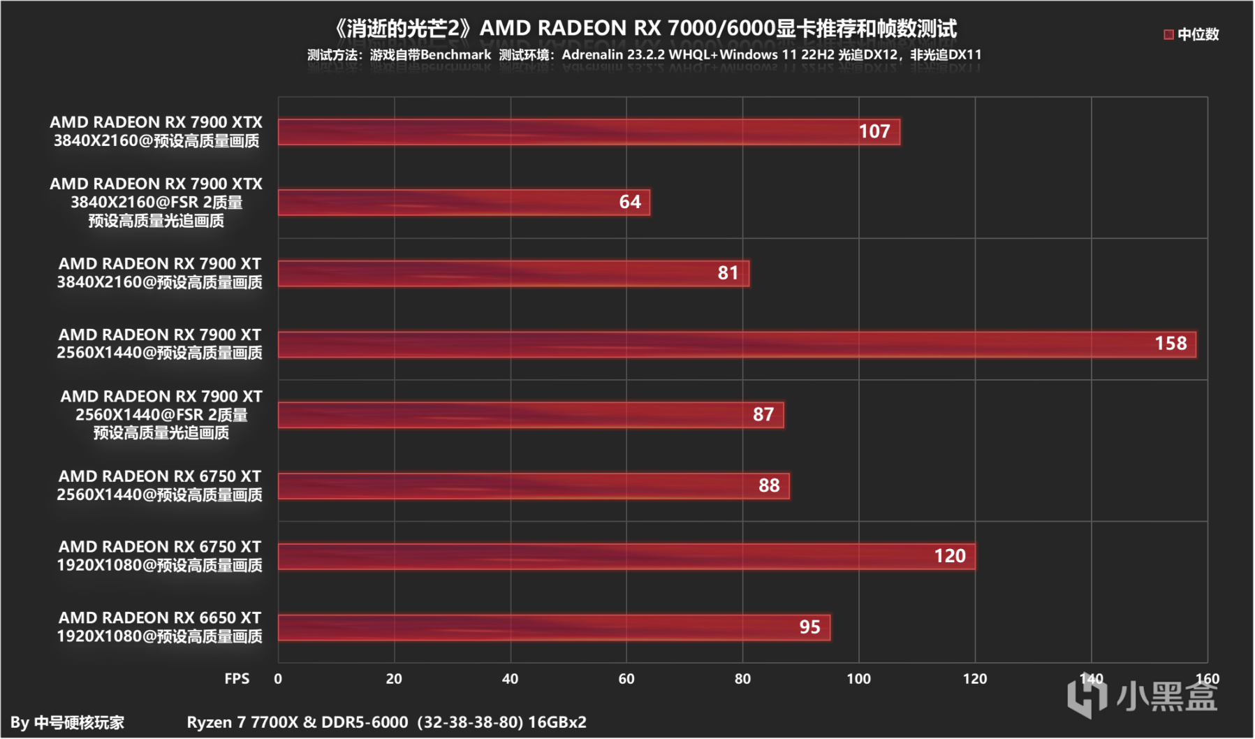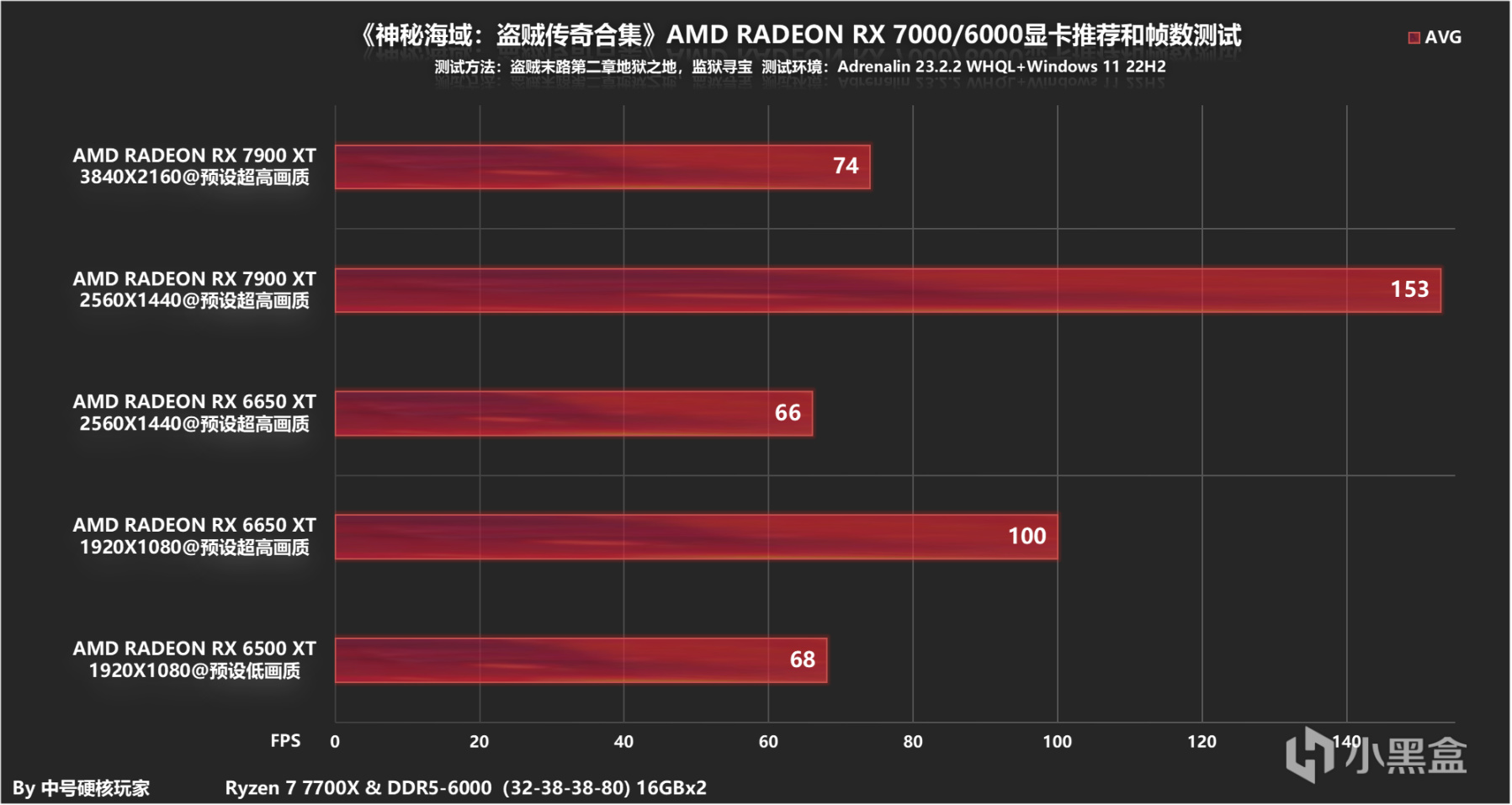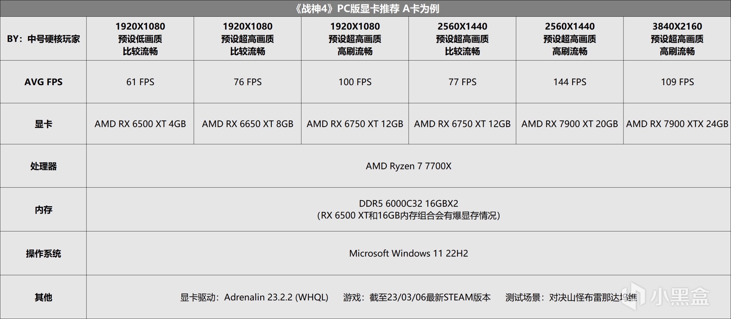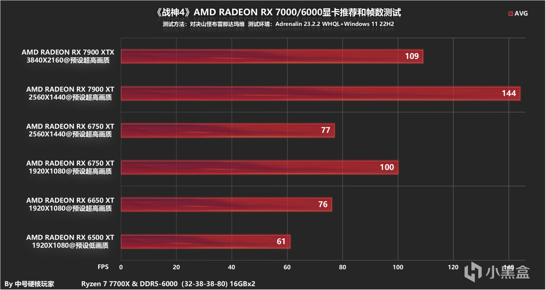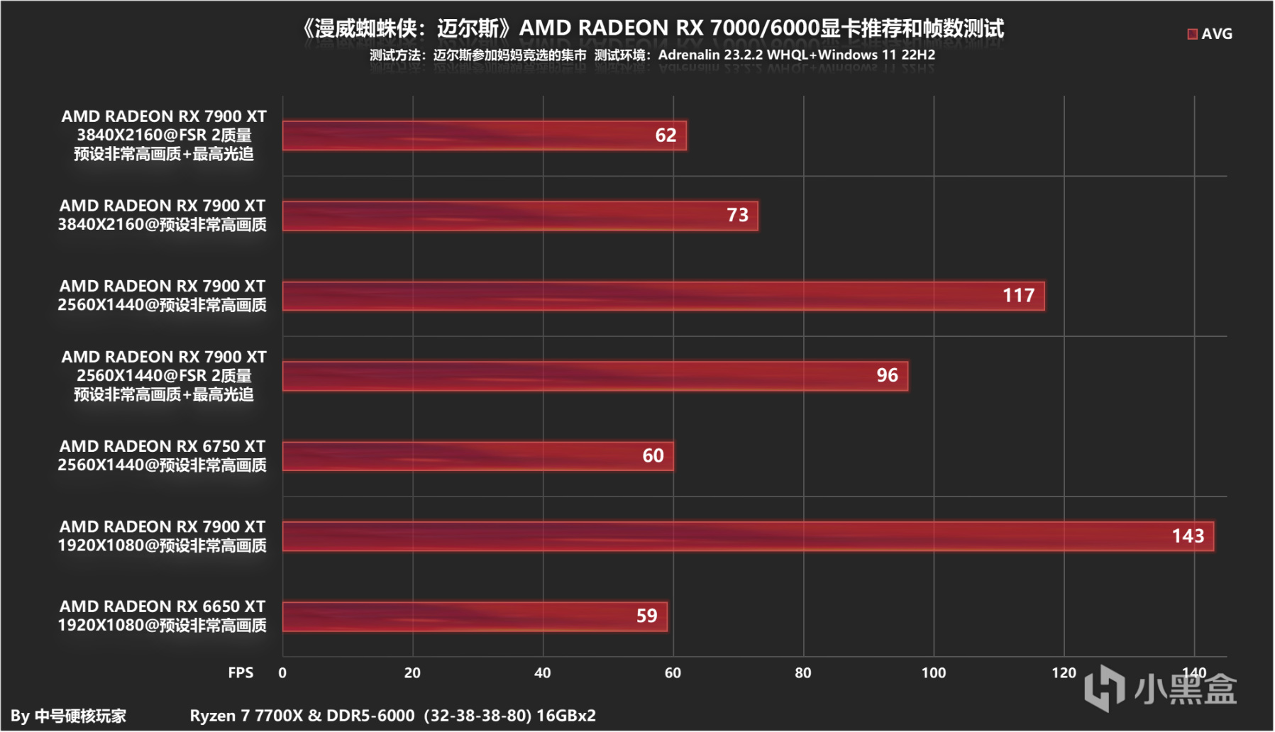 本次測試安裝Adrenalin 23.2.2(WHQL)的顯卡驅動(23年2月23日更新),操作系統是Windows 11 22H2最新版本,處理器是Ryzen 7 7700X是默認PBO AUTO狀態(對於本次挑選的遊戲,一般千元主流級處理器即可滿足),搭配兩根DDR5 6000C32 16GBX2組成雙通道內存,並在BIOS中開啓SAM技術提升一些顯卡性能,測試結果除了光追設置以外不會涉及到FSR技術,因爲這樣纔是最好的保底方案。