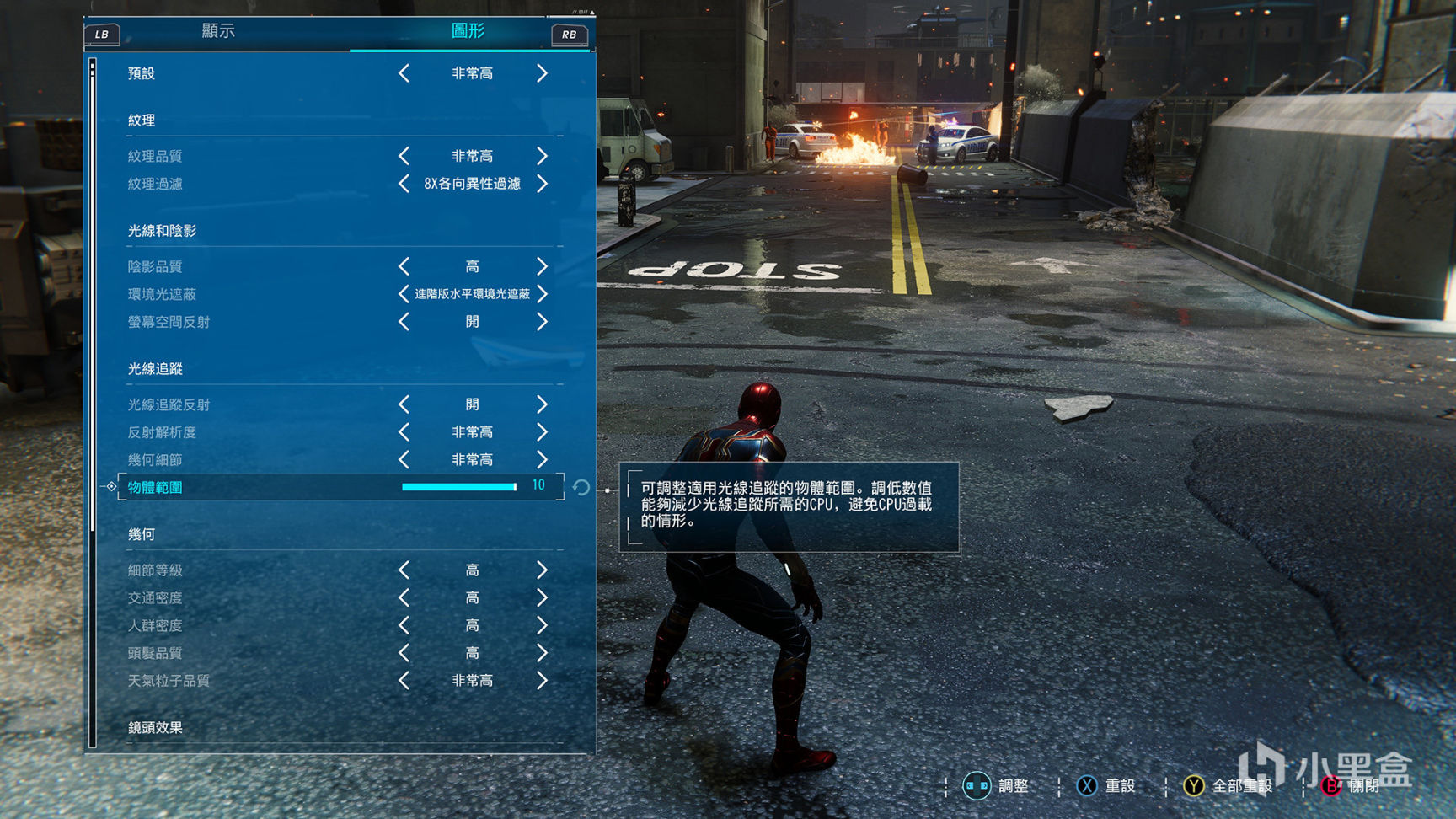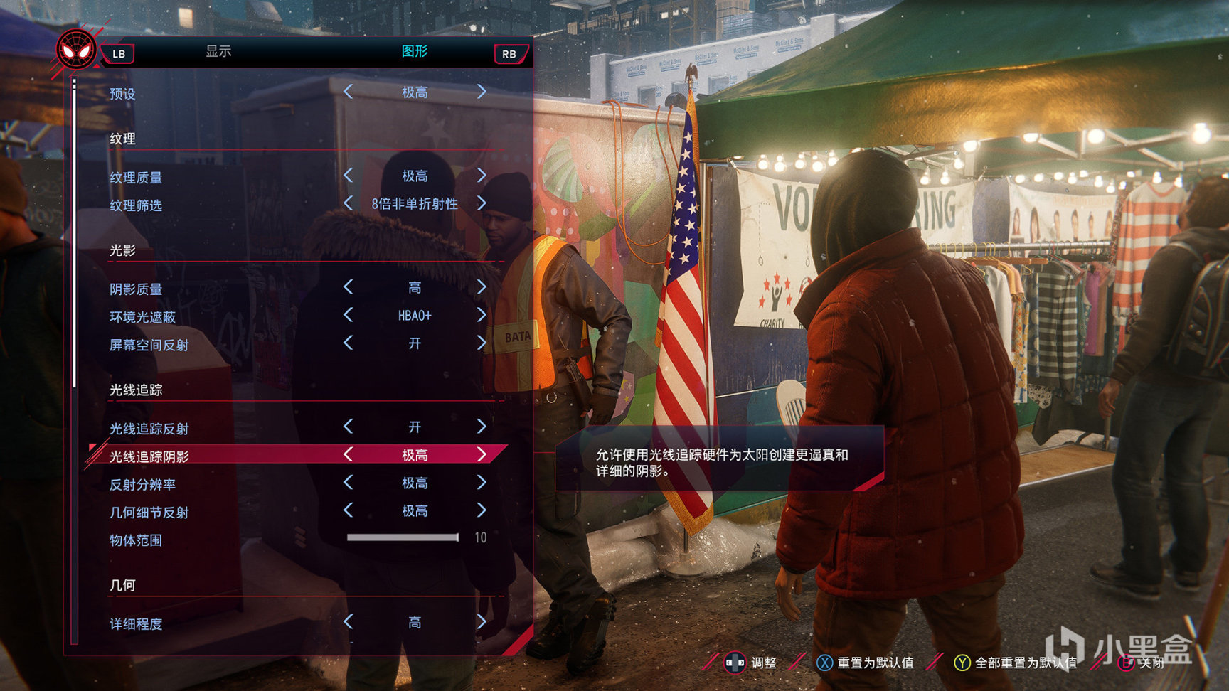 《漫威蜘蛛俠:復刻版》移植工作個人認爲是索尼最成功的作品之一,在遊戲啓動前(Windows)就能調節圖形選項,而在遊戲裏面,圖形選項和遊戲畫面是共存的,可以即時看到調整選項前後效果,還集成了各種提升技術包括FSR 2.1在內,作爲開放式世界遊戲,PC版本也加入了光追反射,在此基礎上還劃分了光追反射幾何細節、光追反射分辨率以及反射目標範圍(1到10),注意這部分CPU性能過低會影響幀數。