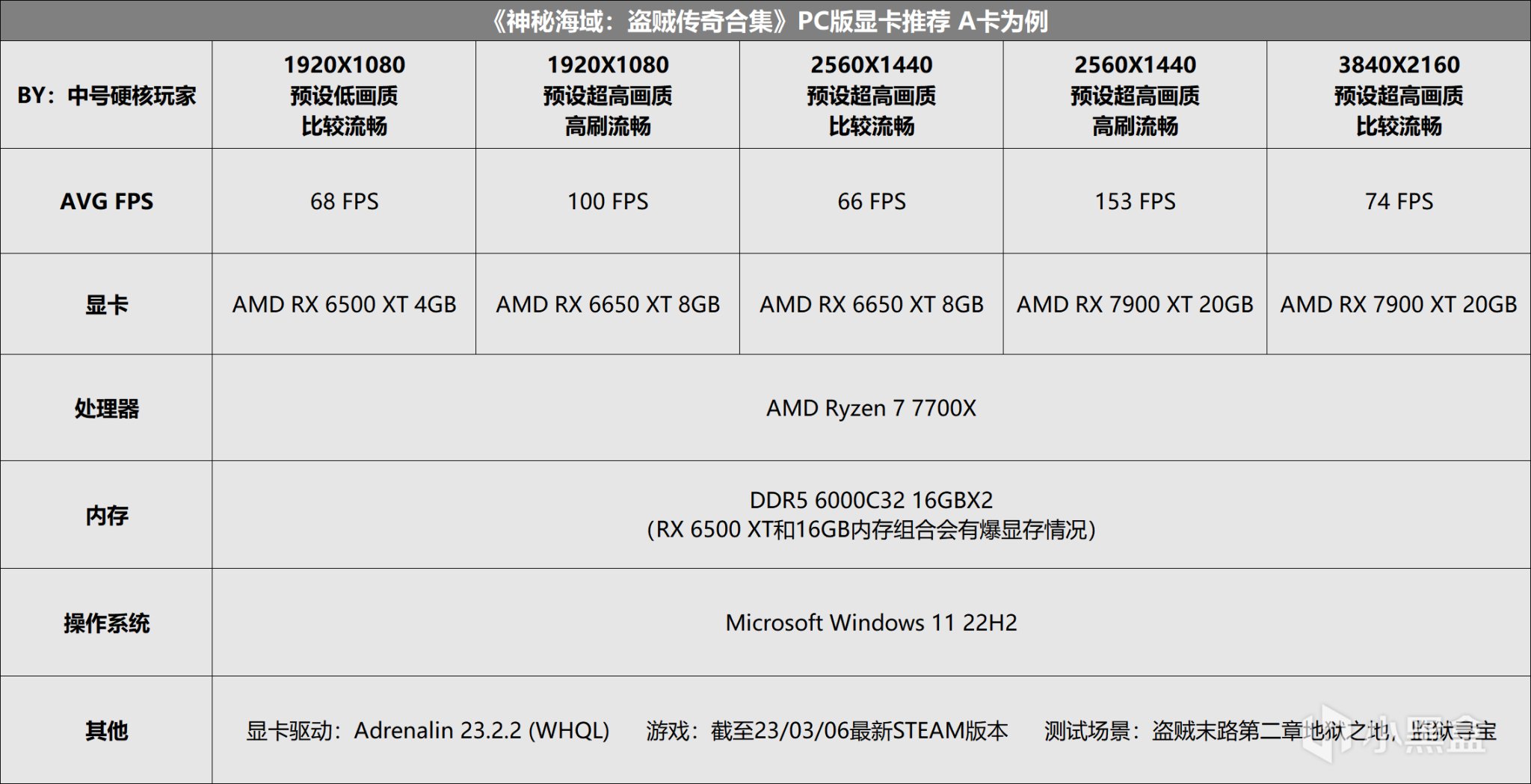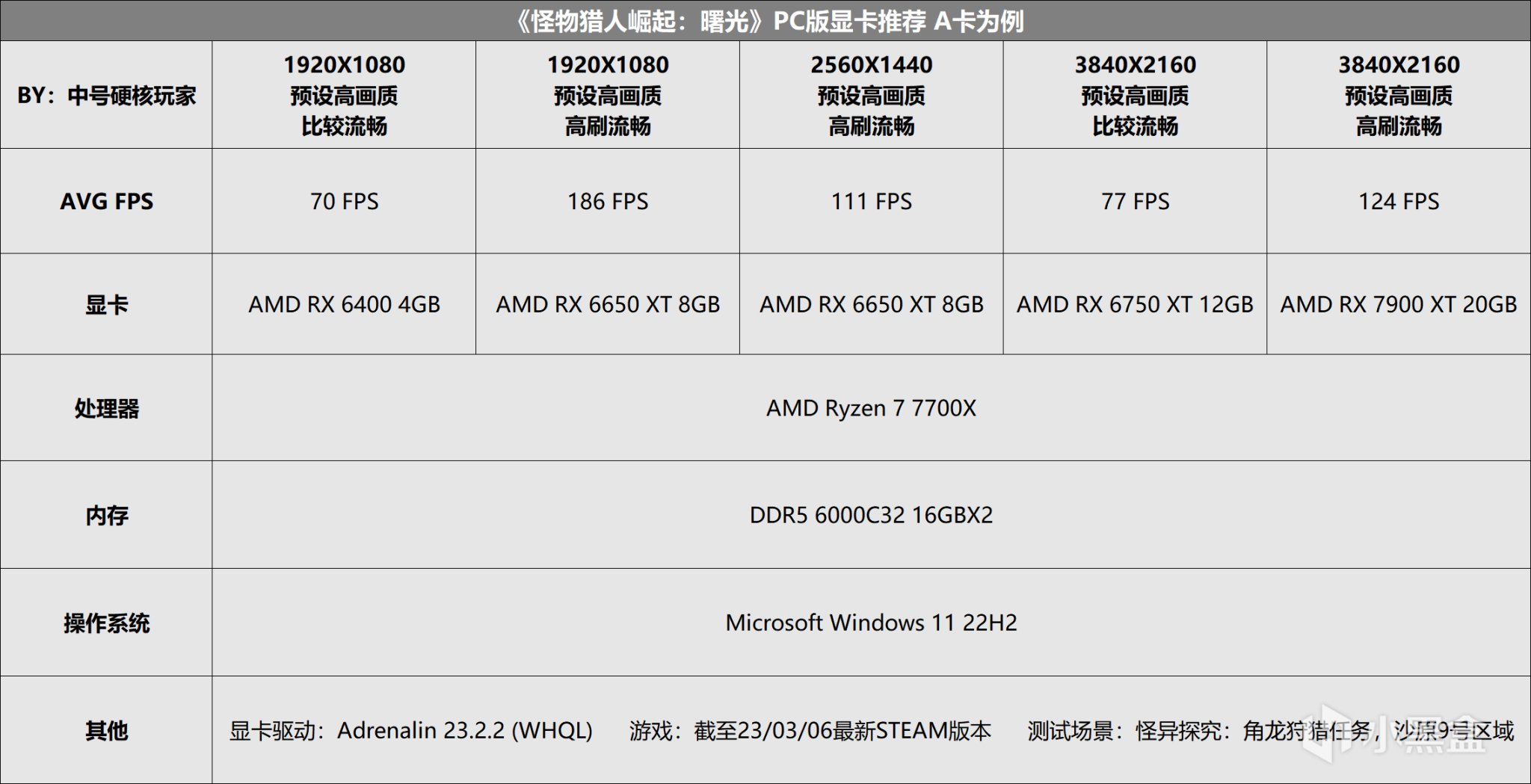 除了遊戲本身好不好玩,PC玩家更多是關心電腦配置是否可以流暢運行,硬核手頭上的A卡會比較齊全(RX 7900 XTX/RX 7900 XT/RX 6750 XT/RX 6650 XT/RX 6500 XT/RX 6400,具體顯卡和其他硬件介紹,可移步到文章最後一部分),這次除了分享每一款遊戲的體驗感受,從千元入門到目前旗艦級顯卡,針對每一款遊戲都進行了最新版本的性能測試,以便大家可以參考。