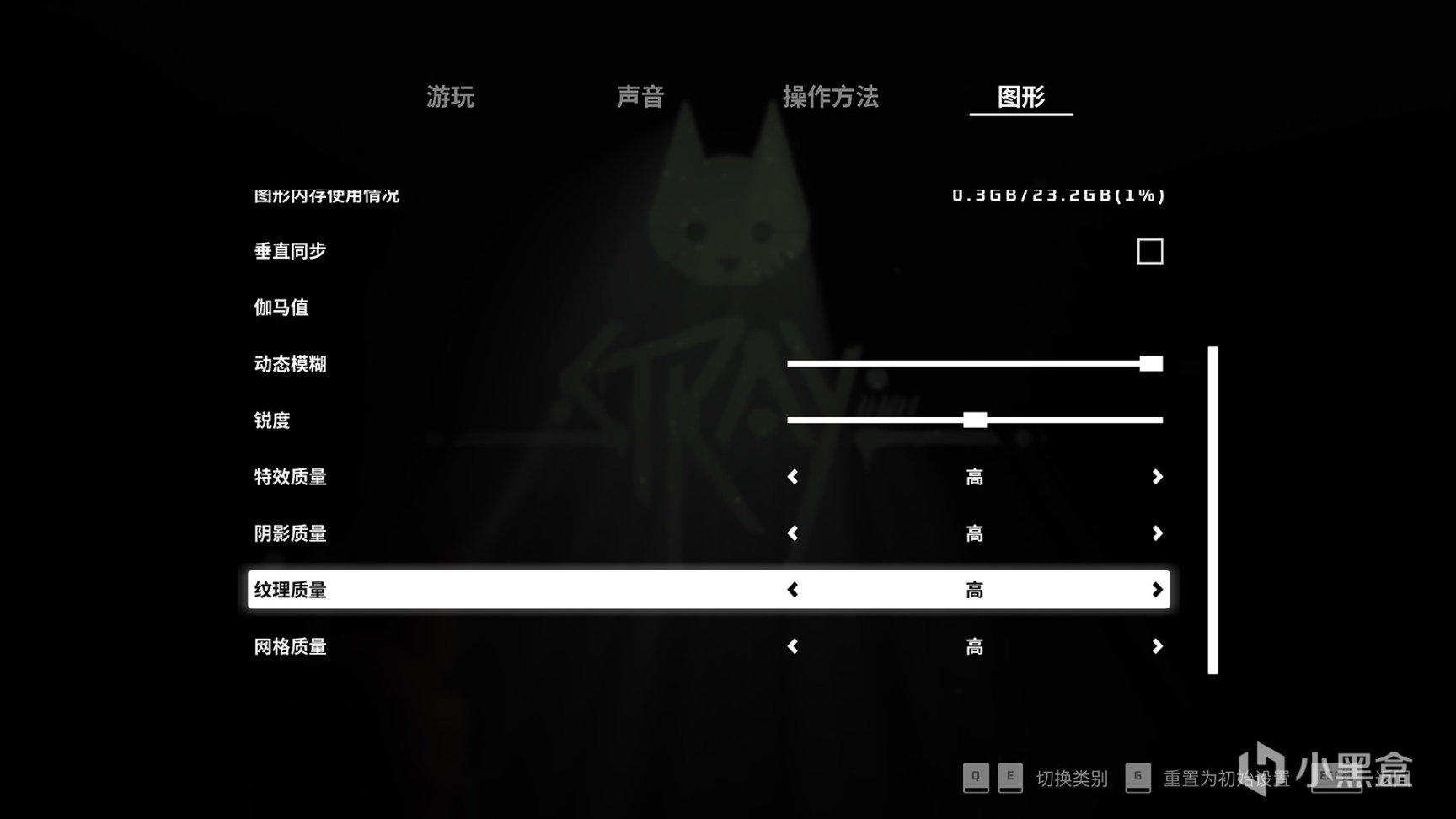 《Stray》也是採用行業內常見的虛幻4引擎,PC版的容量只有6GB左右,畫面設置僅僅提供特效、陰影、紋理和網格四項可選,沒有預設方案可選,測試是直接無腦拉滿的,不過遊戲雖然體量小,但這款遊戲居然對顯存是有基礎要求的。