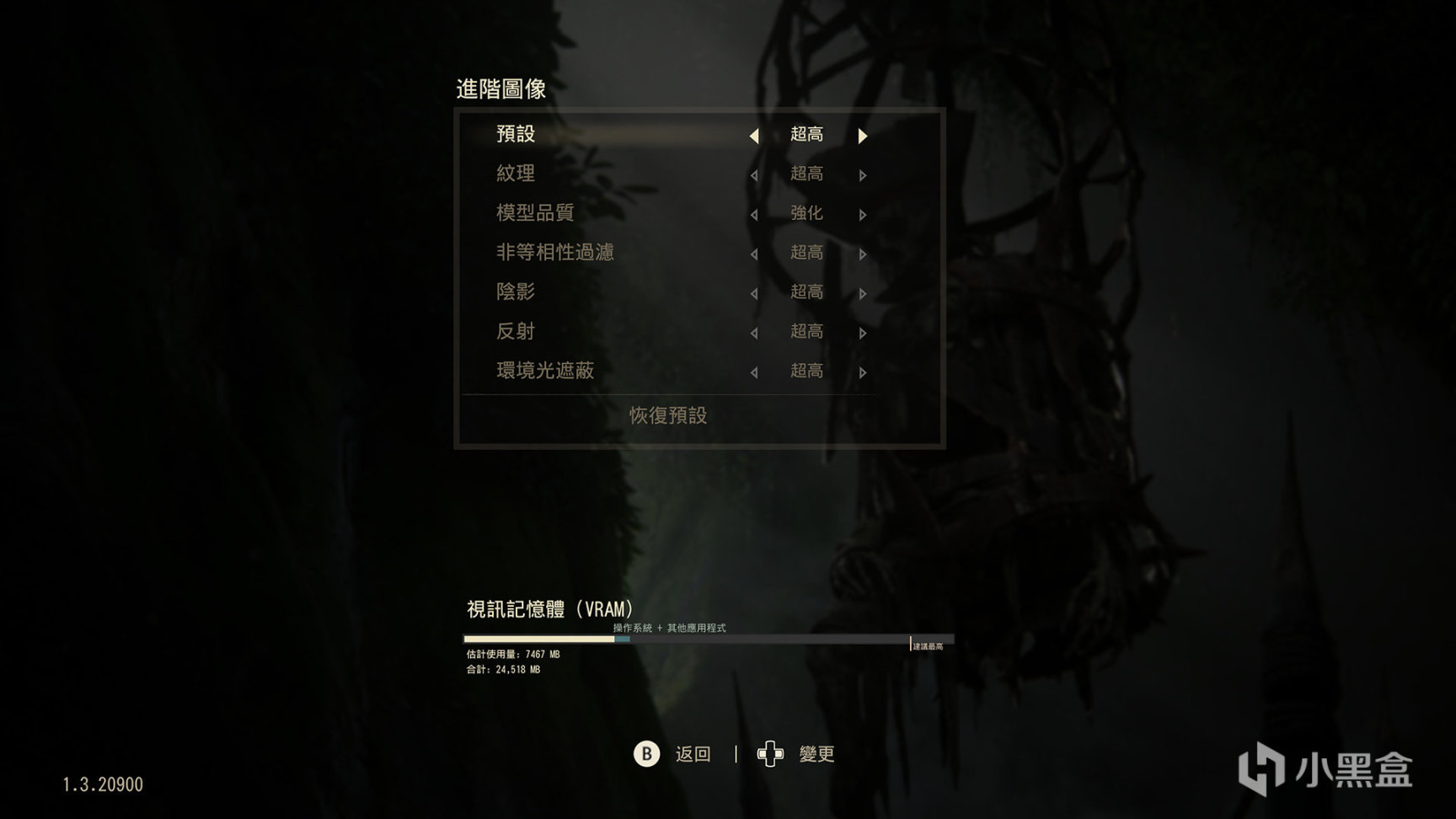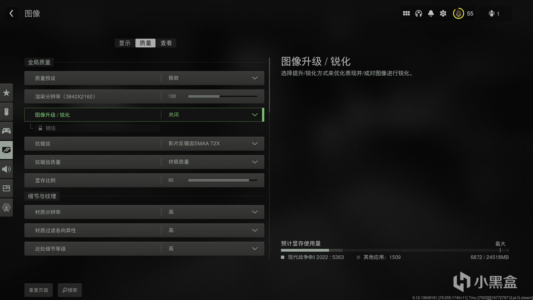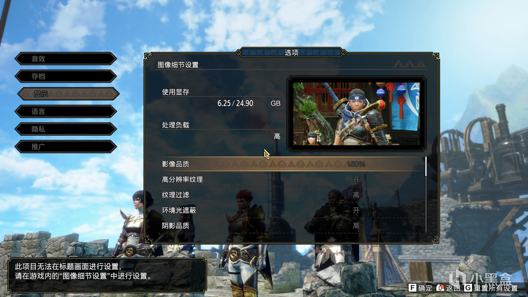 《神祕海域:盜賊傳奇合集》第一次進入界面時會進入漫長的着色器渲染階段,這樣遊玩過程加載時間就減少了,圖形選項設置很簡潔只有寥寥幾個,圖形的界面有一個顯存佔用的長條UI,可作爲調試輔助,遊戲是支持FSR 2.1技術的,移植作業完成效果和《戰神4》高度相似。