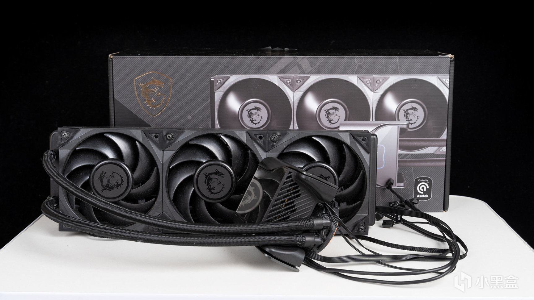 搭配水冷是微星MEG CORELIQUID S360水冷,採用Asetek第七代水泵主流方案,擁有裝飾上蓋+2.4寸的IPS材質LCD顯示屏,在屏幕和水泵之間設計有一枚60mm嵌入式風扇,功能設計足夠全面,性能屬於旗艦級360mm水冷第一梯隊。