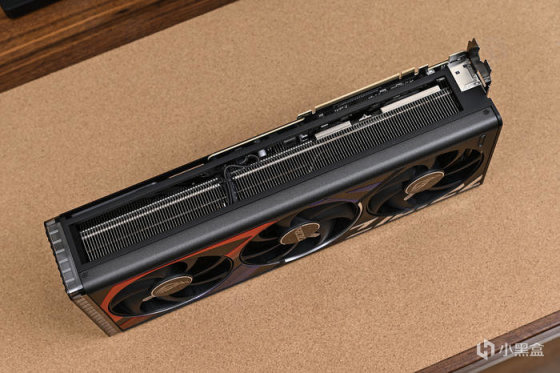 顯卡另一側同樣鏤空設計可以看到超大規模的鰭片散熱模組及合金框架。高質量的壓鑄金屬框架、護蓋和背板,緊緊保護 PCB 並精巧引導風流。