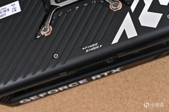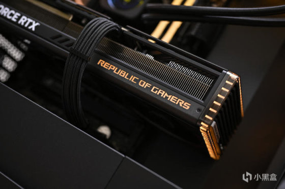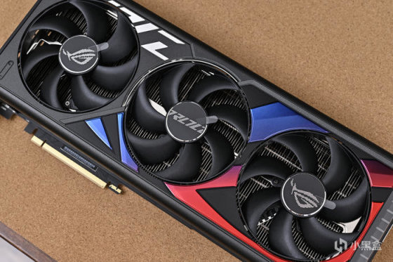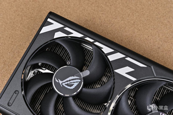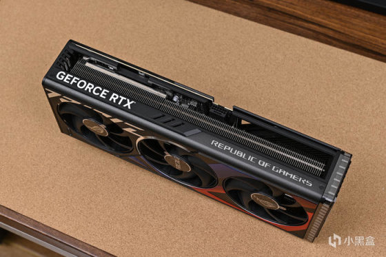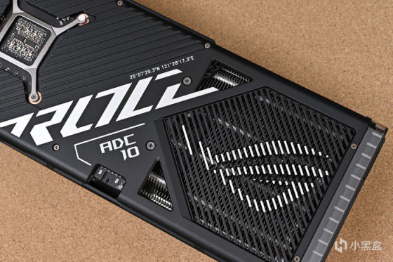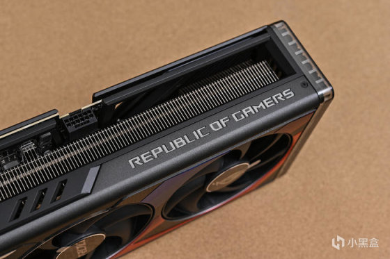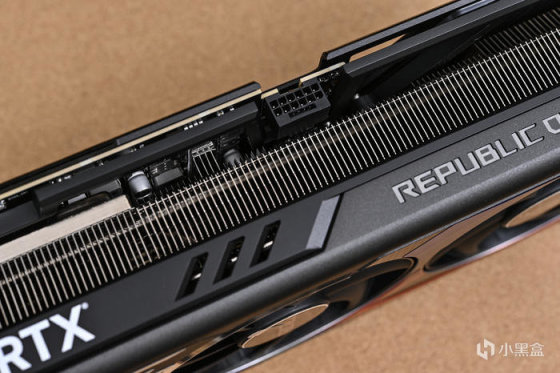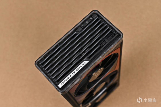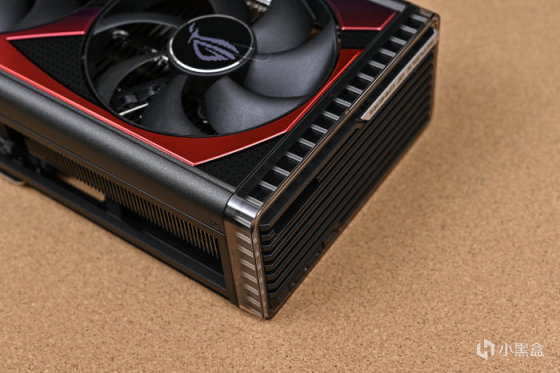 顯卡尾部斜紋格柵鏤空處理,尾部鏤空式設計,貫穿通風,減少尾部重量防止下垂,同時兼顧散熱風道。上面還雕刻有 ROG Logo,每一個組成條紋均爲高光倒角處理。