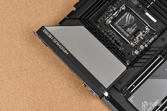 供電 I/O 散熱裝甲單面鏡+LED 點陣設計,加入 Polymo 動態燈效,可同時呈現 2 種圖案,可呈現 ROG/HERO 兩種圖案,並支持動態效果,可變幻絢麗多彩的個性圖案。左上角還有銀色 MAXIMUS HERO 字樣。