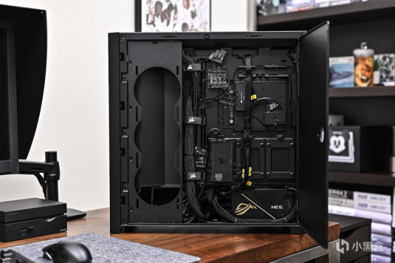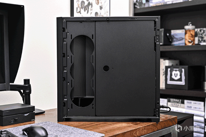 可安裝 360mm 冷排 亦或是 3 顆 120mm 風扇。右側是一個磁吸合頁艙門,打開後機箱背面才真正展示。