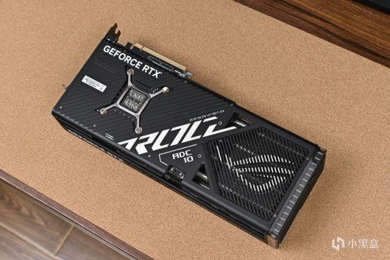 顯卡背板左側斜紋切割紋理,左上角是 GEFORCE RTX 標識,中央爲 ROG 圖騰文 Logo。