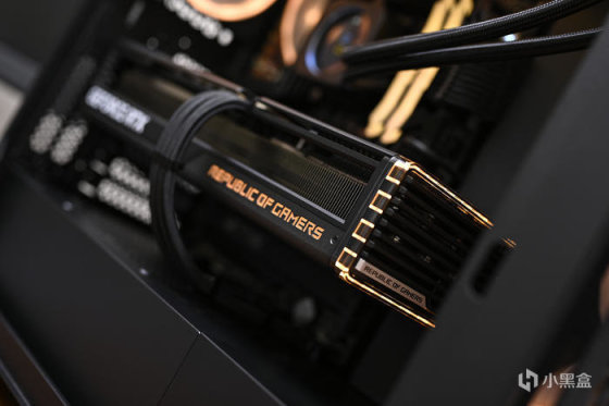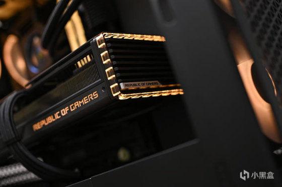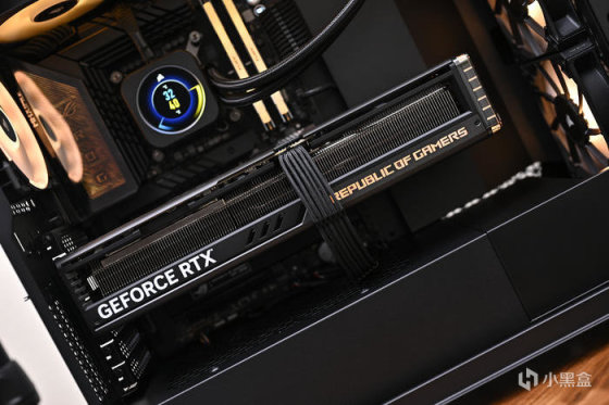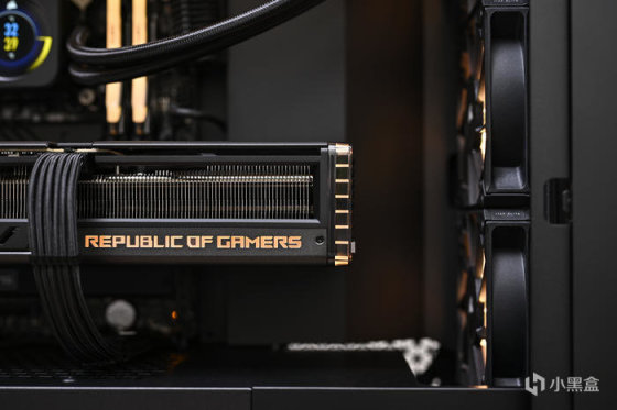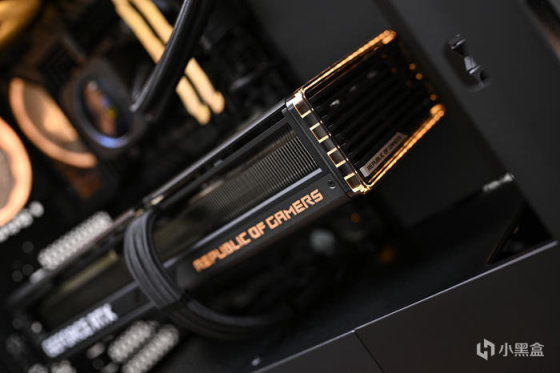 顯卡側面右側下方是 REPUBLIC OF GAMERS Logo 字樣,右側透明亞克力爲環形燈帶,同時具備 ARGB 燈效。