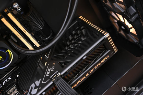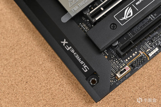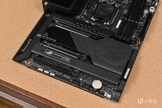 主板下方通體覆蓋大面積厚實的散熱裝甲,PCH 散熱器的外觀銀黑條紋組成的ROG信仰之眼,無 ARGB 燈效,個人更喜歡這樣有金屬質感的無光設計。兩個PCIe5.0 x 16 擴展插槽的表面均有金屬保護罩,提高接口強度的同時還可以避免信號干擾,下方還有一個 PCIe 4.0x16 插槽。第一條 PCIE X 16 支持最高 PCI-E 5.0 X16,第二條 PCIE X 16 支持最高 PCI-E 5.0 X 8 (以上 2 根共享 CPU PCI-E 5.0 X16,提供 X16/X0 或 X8/X8 的組合),最下方PCIE x16 實際爲 PCI-E 4.0 X8 的通道,方便支持 ROG HYPER M.2 CARD 上的雙 PCI-E 4.0 X4 M.2 SSD。