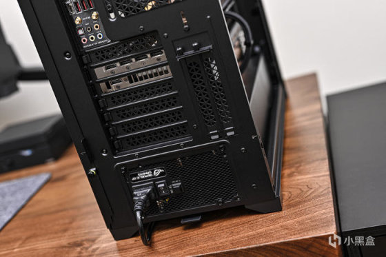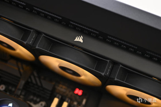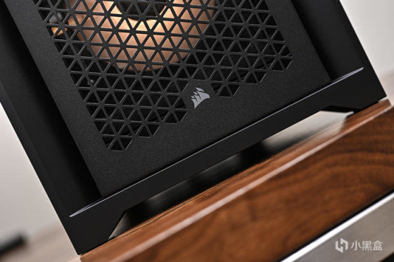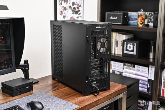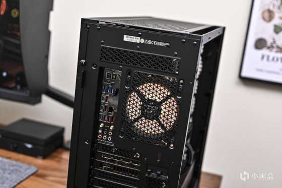 機箱尾部上方左側是主板 I/O 接口,右側是 1 個 120mm 風扇位,安裝了 1 顆海盜船 LL120 RGB 風扇排風。