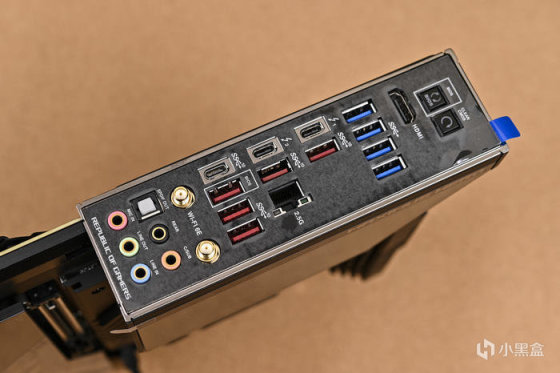 接口方面是非常豐富的,從上到下分別爲:1 x BIOS FLASHBACK 按鈕、1x CMOS 按鈕、1 x HDMI 2.1 端口、4 x USB 3.2 Gen 1 5Gbps Type-A 接口、2 x Thunderbolt 4 Type-C 40Gbps 接口、5 x USB 3.2 Gen 2 10Gbps Type-A 接口、1 x 2.5 Gbps 有線網口、1 x USB 3.2 Gen 2 10Gbps Type-C 接口、2 x Wi-Fi 6E 無線天線接口、5 x3.5mm 音源孔、1xOptical S/PDIF 輸出音源孔。