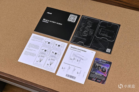 附件方面,包括說明書、可組裝的華碩感謝卡、支架及供電線材使用指南,以及一張 ROG 產品收藏卡。