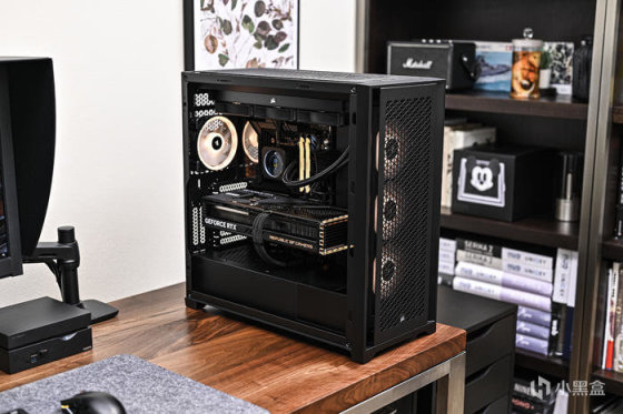 今天裝一臺黑金風格性能主機——海盜船 5000D RGB AIRFLOW。海盜船 5000D RGB AIRFLOW 是一款做工非常紮實的鋼製 ATX 中塔機箱,黑白雙色可選,本次展示的是黑色款,尺寸:520 x 245 x 520mm,通體黑色外觀,鋼結構框架,自帶三顆 AF120 RGB ELITE 風扇,通風透氣的前面板帶來更好的進風量,CPU散熱器最大 170mm,顯卡最大 420mm,電源最大 250mm,應對目前的 40 系旗艦級平臺還是比較輕鬆的。空間利用很充分,頂部、前面板、還有側板均可安裝 360mm 水冷排,電源倉上方開孔可安裝額外兩顆 120mm 風扇輔助顯卡散熱。需要注意的是主板右側與機箱正面不可同時安裝 360mm 冷排,頂部冷排安裝要注意厚度,過厚會造成水冷風扇和主板 CPU 供電線擁擠。
