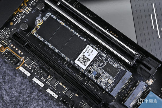 拆除厚重的散熱片,可以看到主板提供了 3 個 M.2 數據接口,均預貼了導熱貼,均支持 M.2 Q-LATCH 快裝快拆設計,其中兩個支持 PCIe4.0x4,另一個支持 PCIe4.0x4&SATA 模式,最上方爲直連 CPU。
