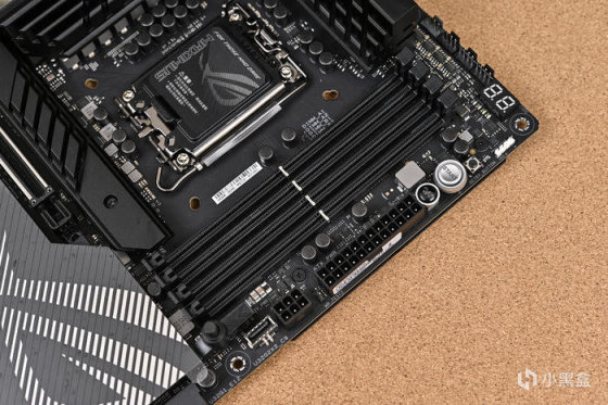 ROG MAXIMUS Z790 HERO 提供了四個最高支持 128GB DDR5 7800Mhz 的內存插槽,右上角標配 Debug 偵錯燈、獨立開關機和重啓鍵方便裸板超頻使用。