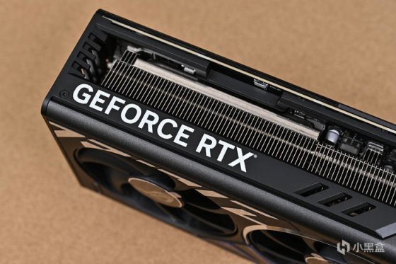 整卡 3.5 槽厚度,顯卡側面可以看到中央全部鏤空式設計,內部密集的散熱鰭片,核心採用均熱板直觸與熱管內埋設計,內置四個 8 毫米和三個 6 毫米熱管,均熱板具有銑削而成的凹槽,讓散熱導管下嵌而不被壓平,使熱源更有效傳遞到鰭片。相較於傳統的熱導板和熱導管組合,這種強大的組合在承受 500W 散熱負載時,可讓 GPU 溫度降低多達 5℃。大規模散熱系統具備更大的散熱空間和更多的散熱鰭片,針對三個軸流風扇的風量進行優化,可高效傳導 GeForce RTX 4080 GPU 的熱量,再由三個軸流風扇高效率排散。