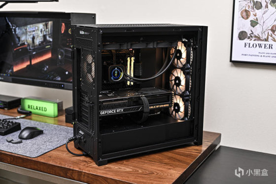 機箱左側免工具拆裝的鋼化玻璃側板,可以更好的展示高端硬件和 RGB 燈光的燈效。
