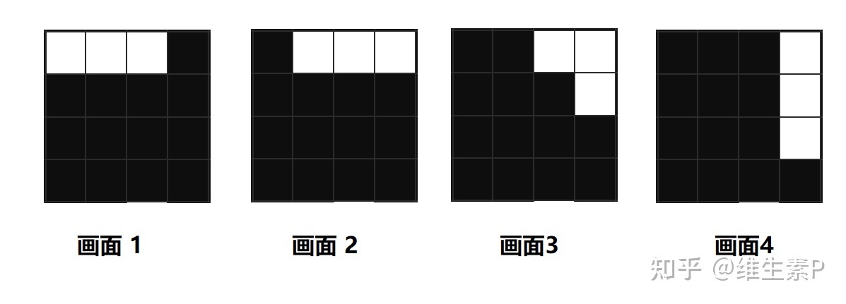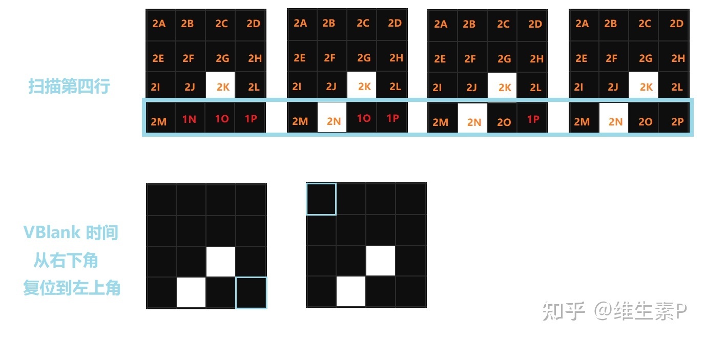 現在的顯示器一般採用逐行掃描的方式來刷新屏幕畫面,也就是說,這裏的16個格子全黑的時候是一個固定的畫面,當這個畫面要刷新的時候,屏幕是從最上面的左上角開始,從左往後一行行的進行一個個格子的刷新的。