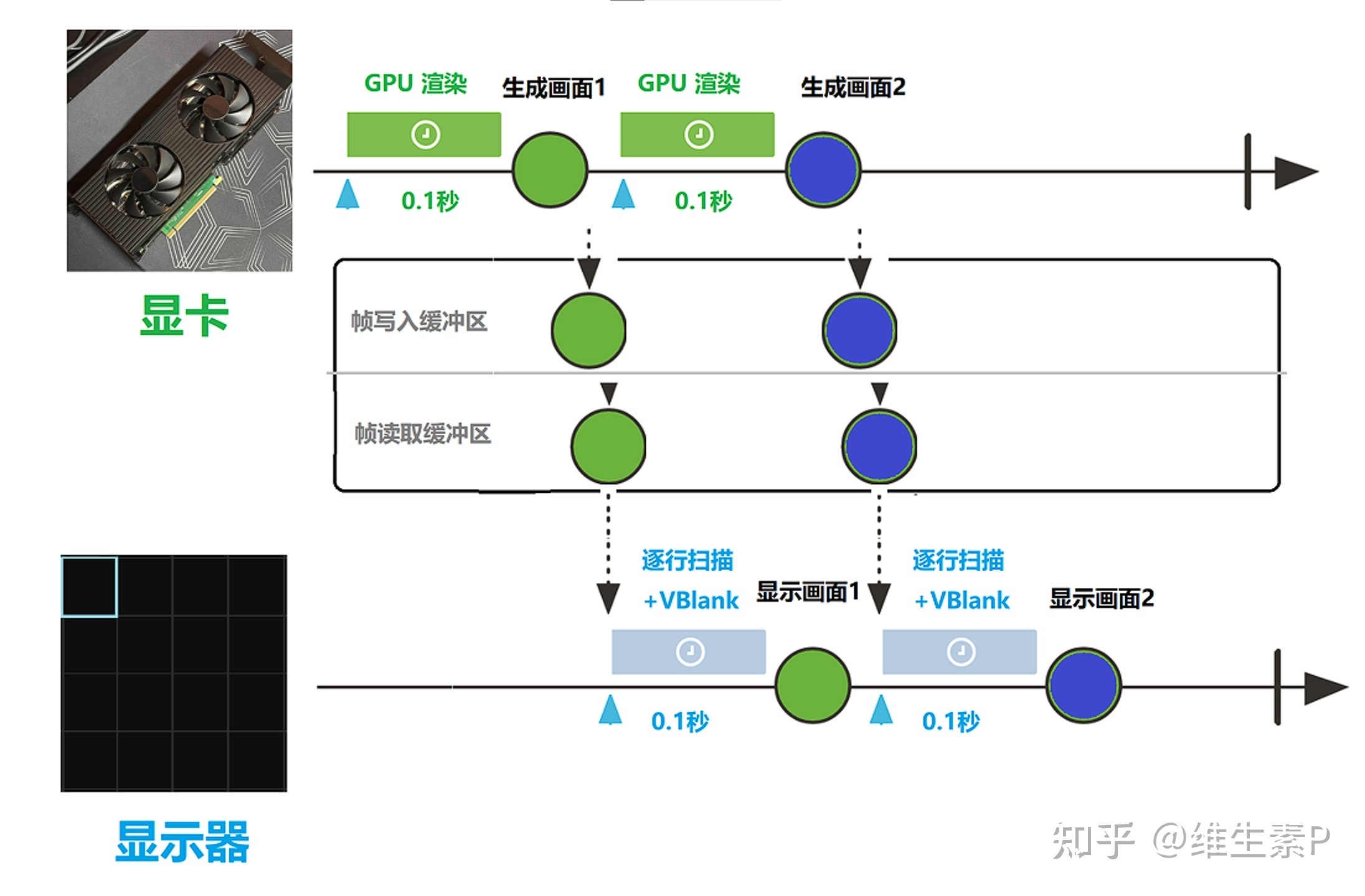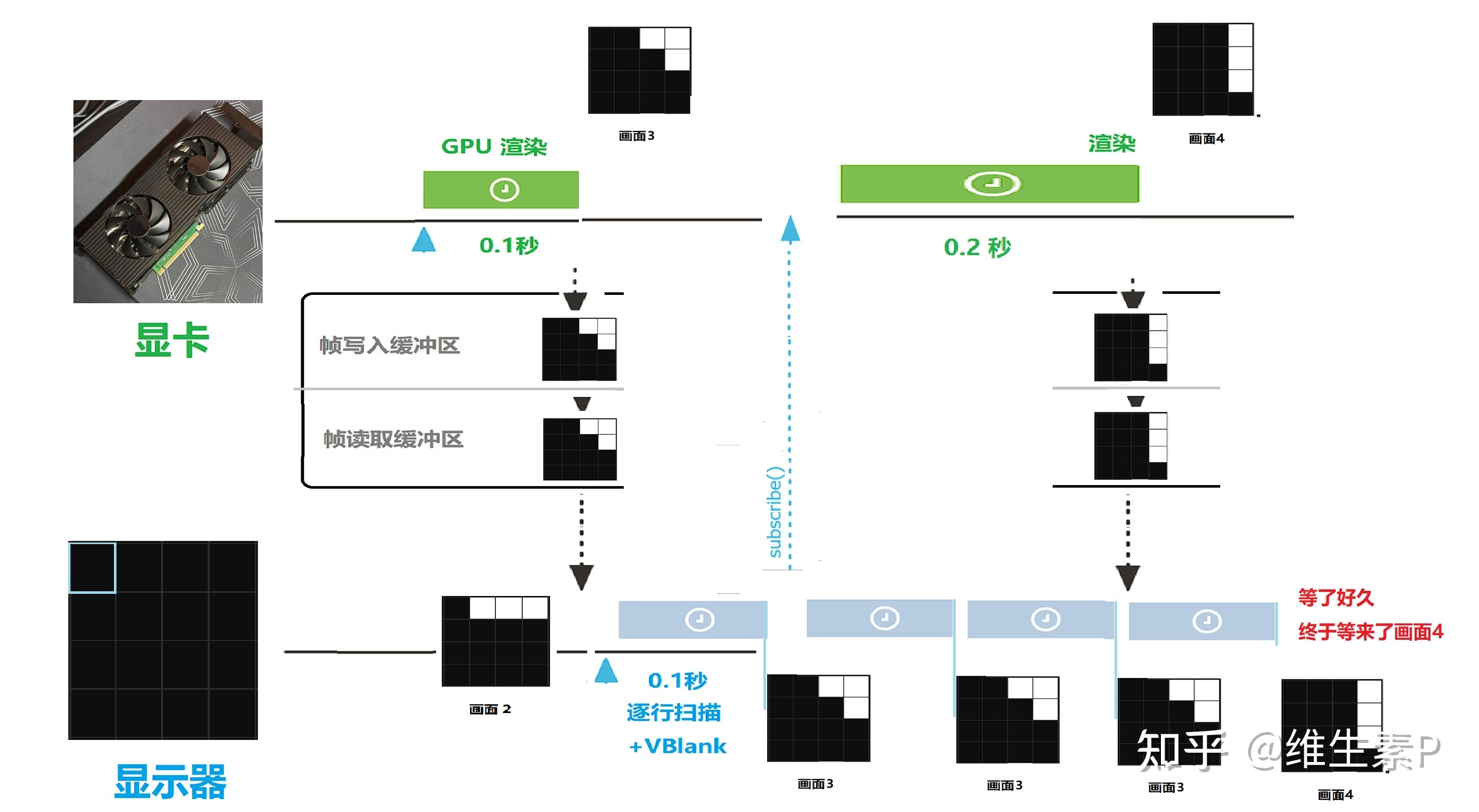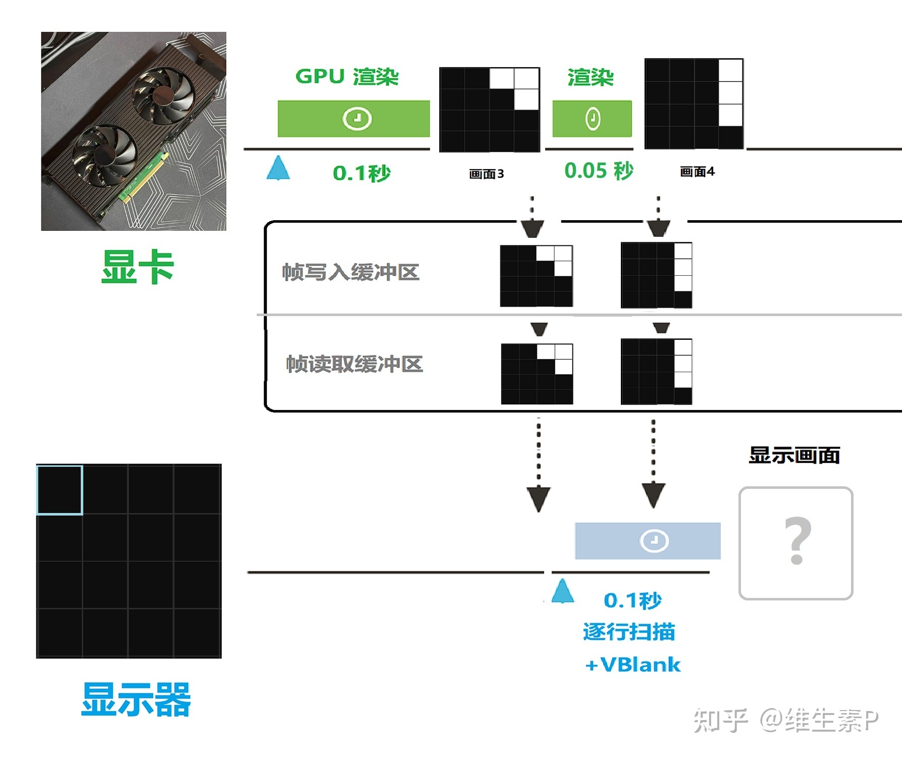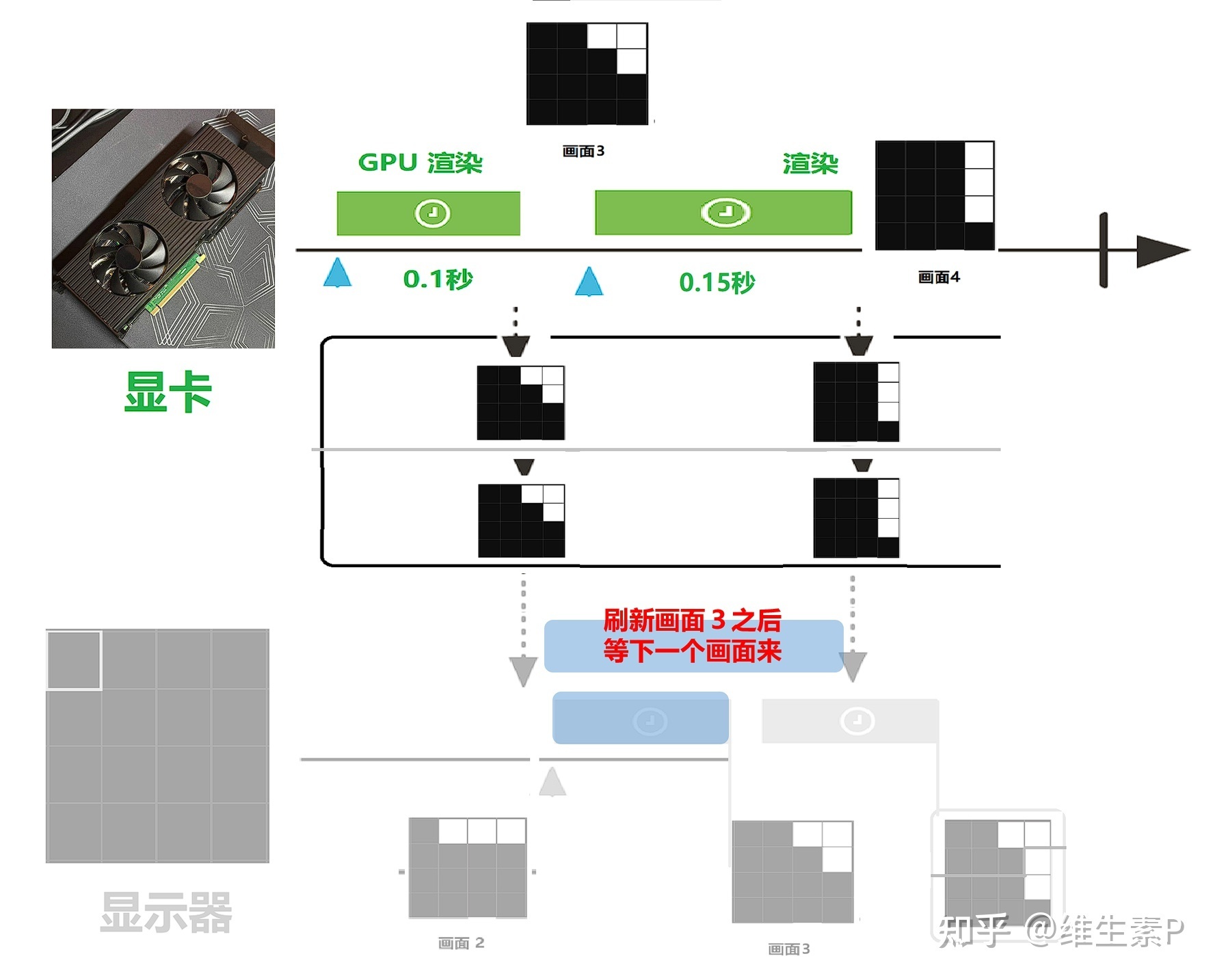 假如說,顯卡渲染完畫面3之後就開始等,等到顯示器真正把畫面3刷新完了,然後再開始生成畫面4,但好巧不巧,顯卡累了,這次渲染花了0.2秒,於是顯示器等呀等,等了好久終於纔等來了畫面4.