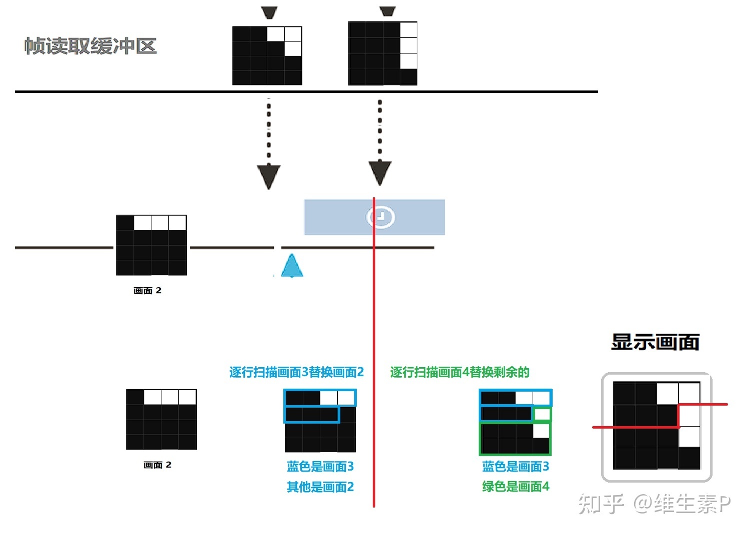 所以,在顯示器進行逐行掃描到一半的過程的時候,緩衝器數據進行了交換,那麼後續繼續掃描就會把下一個畫面的像素給掃上來。