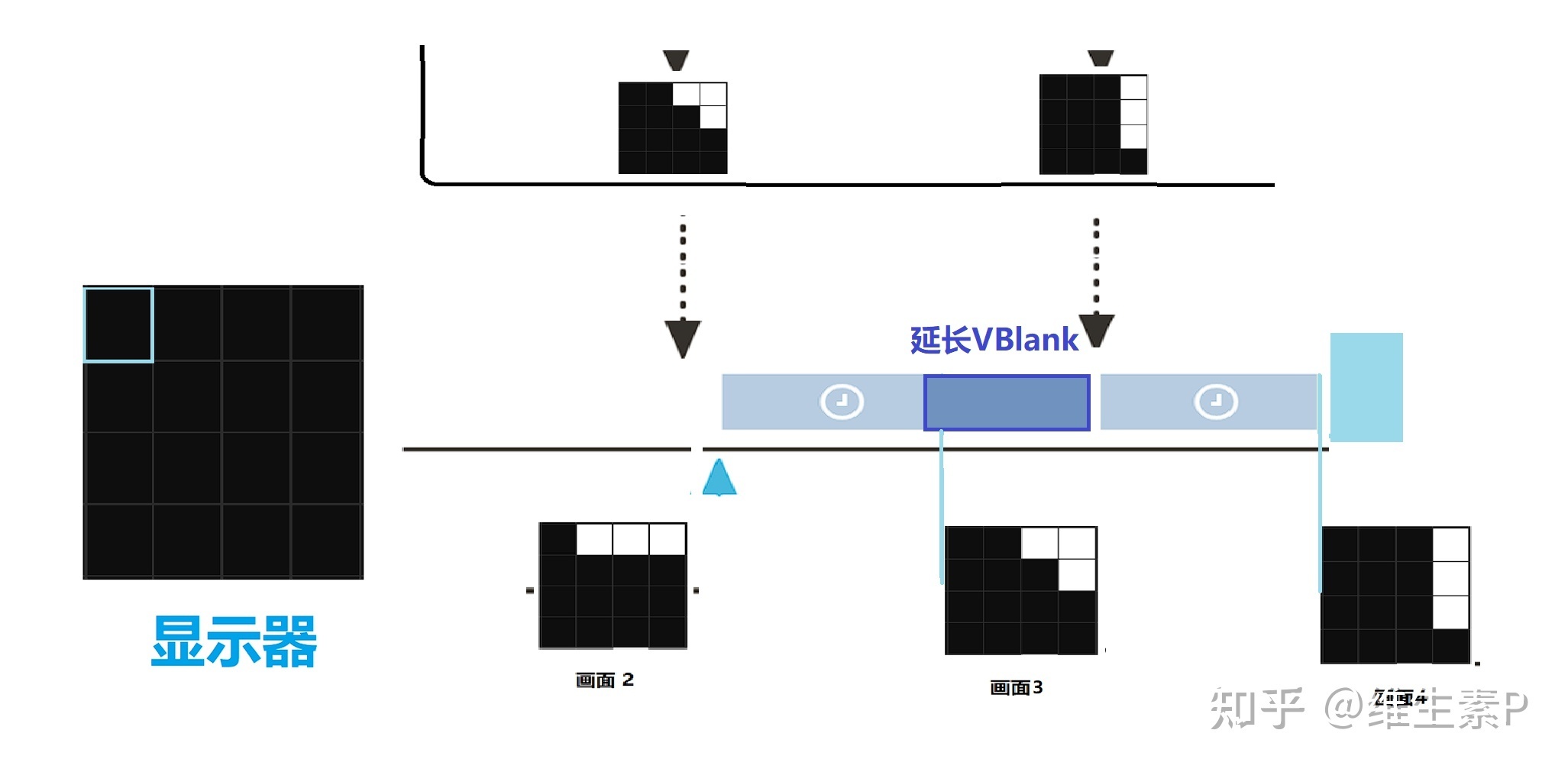 最開始時候,我們提到過,顯示器進行逐行掃描刷新畫面之後,會有一個從右下角復位到左上角第一個像素位置的 Vertical Blank 時間,實際上這個時間是非常短的,但是我們可以用一些技術手段,去控制這個時間。