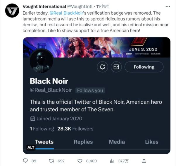 對此,沃特國際公司也在推特上表示:玄色的驗證標識已被移除。蹩腳的社媒將利用這一點散佈關於他死亡的荒謬謠言,但請放心,他還活得好好的,而且他的關鍵任務即將完成。請大家點贊以表示對這位真正的美國英雄的支持。