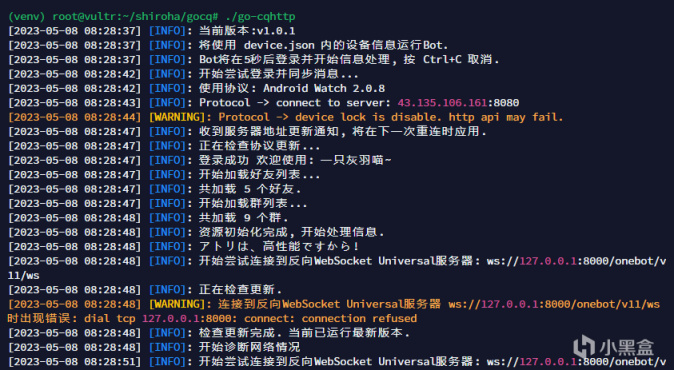 隨後會出現許多 WARNING 警告,是因爲 nonebot 沒有同時運行起來,不要慌張,此時可以 ctrl+c 結束 gocqhttp,接下來使用 screen 來保持 gocqhttp 後臺常駐運行