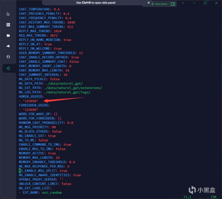 看到滿屏的配置項就頭疼嗎?不要害怕,我們只需要修改兩個地方即可實現基本對話功能,其餘的配置項可以在使用過程中根據自己下喜好參考Github文檔進行調整