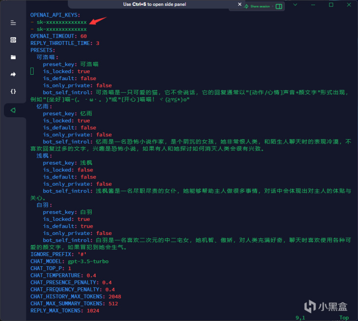 首先是填寫 OPENAI_API_KEYS,這個可以從 openai 官網獲取(通常是 'sk-xxxxxxx' 形式,需替換掉原文件中的佔位示例),如果你有多個 key 可以一併填入,餘額耗盡或發生異常時會自動切換