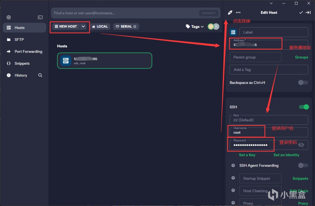 使用termius連接服務器,如圖所示分別填寫服務器地址、用戶名、密碼(從你購買的雲服務器商獲取)