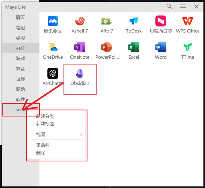 8.鼠標右鍵點擊該分類,就可以進行編輯操作。也可以直接用鼠標左鍵拖拽軟件到其他分類