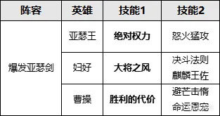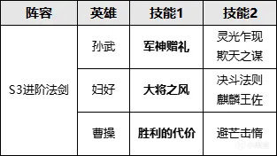 加粗部分是核心技能,其餘技能可根據玩家實際情況進行調整。婦好的固有技能彌補了法劍以往沒有續航的不足。婦好能提高主將100%發動率,搭配曹操跳過準備階段,給孫武刷兵聖狀態,法劍升級爲“法術機關槍“,能抗能打。而此陣容的缺點之一就是害怕沉默效果,當遭遇狀態弓的時候不但兵種被剋制,陣容也會遭到剋制。