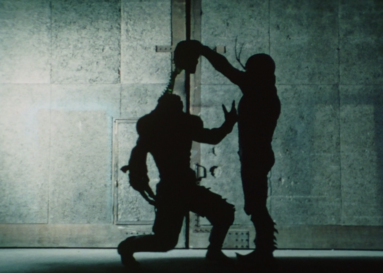 這次實驗結束後,男主小真得以出門休假,報紙上的警察團滅新聞讓他知道了他的夢是真的,自己也許就是那個兇狠的殺人狂。懷着恐懼與疑惑,小真跟蹤了可疑的鬼冢。鬼冢不僅是個狂熱的激進科學分子,他甚至偷偷開闢了自己的實驗室並拿自己做實驗,實驗儀器讓鬼冢產生劇烈的痛苦,這些痛苦竟然也能讓躲藏在附近的小真也感同身受。疼痛讓隱藏在天花板的小真掉下來昏死過去。同時一隻武裝隊伍也從天花板突入攻擊鬼冢,鬼冢變身爲綠色怪物攻擊武裝分子,宛如屠殺豬狗一般。等一切歸於沉靜之後,男主終於甦醒。看着一地屍體的實驗場地, 男主痛苦的認爲都是自己所爲。