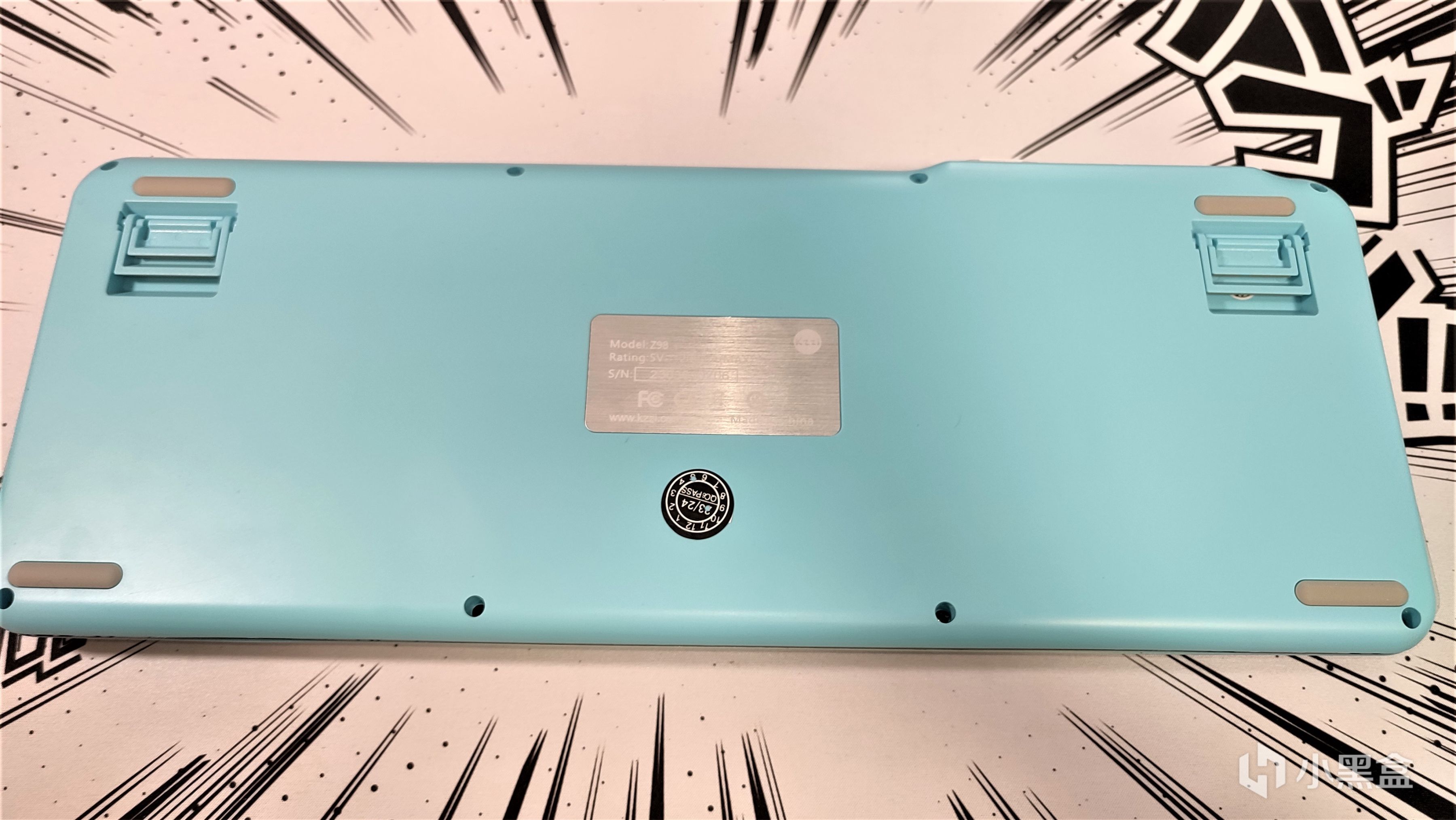 背面的顏值相較正面差了一點,不過想必一般人也不會把鍵盤翻過來看,尤其是接收器收納倉和三模切換開關都不在背面的情況下。所以Z98的背面顯得就十分簡約,防滑腳貼外加二段腳撐,再加上中間的記錄了一些信息的銘牌就沒了。