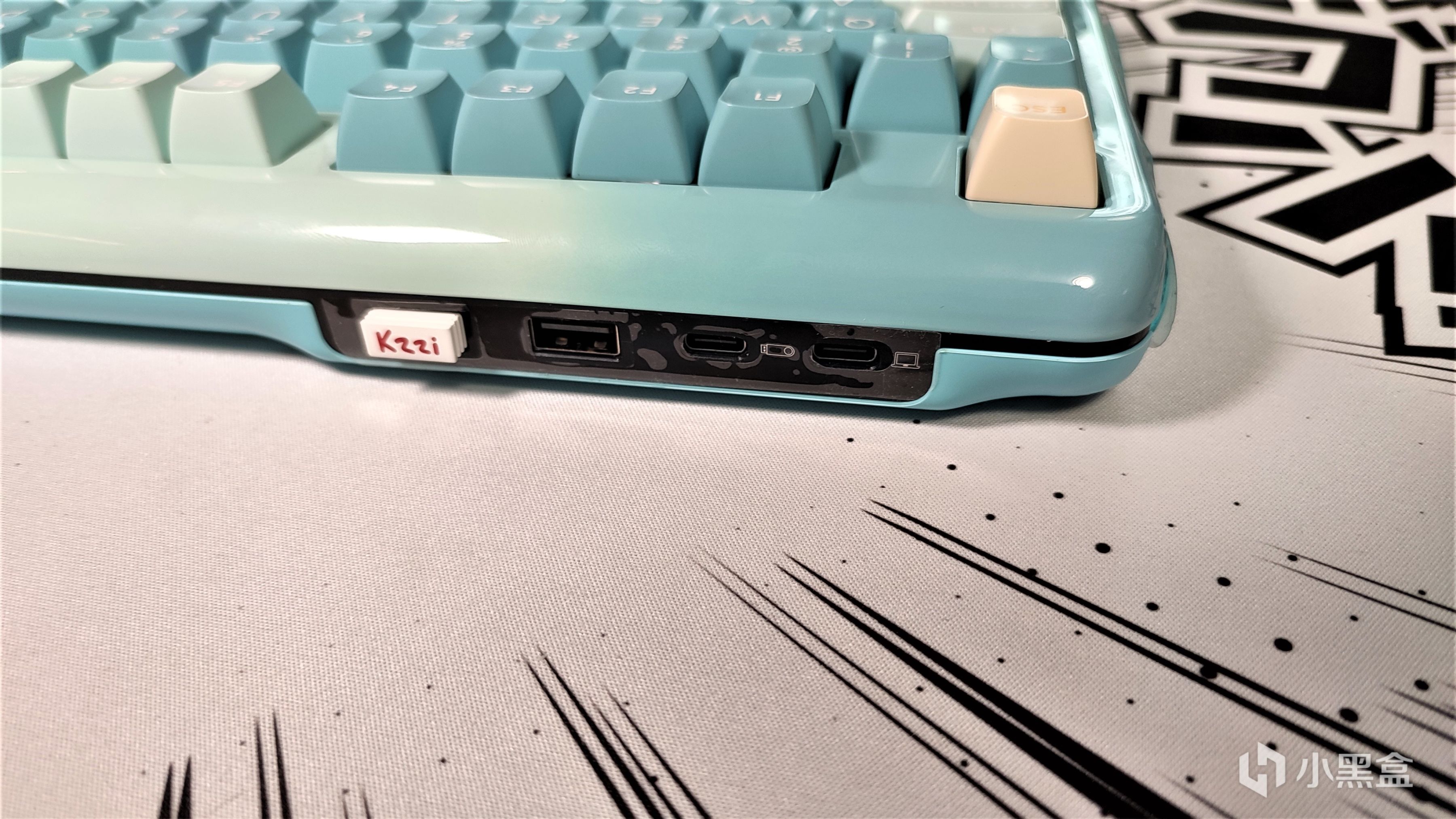 後側面的設計和前側面大差不差,差別則在充電口這個位置,從左到右依次是:接收器收納倉(磁吸)/擴展HUB(USB-A)/擴展HUB(Type-C)/數據線插口。依舊是保留了K75的擴展HUB設計,但同樣也是隻有在有線模式下才能使用這兩個接口,好處就是有線模式下不用將鼠標接收器插入電腦,省下了一個插口,同時接收器離鼠標近了也能防止干擾。