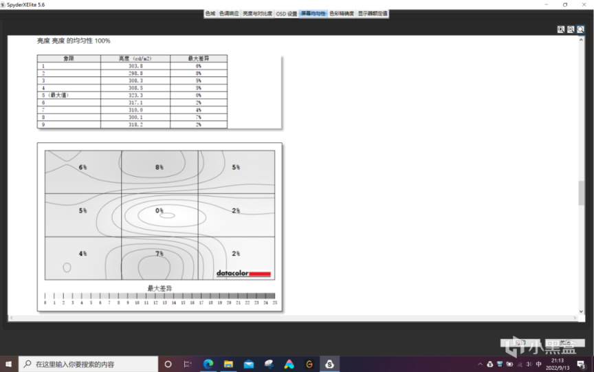 亮度均勻性表現不錯,測試時只有一處低於300尼特,298.8。