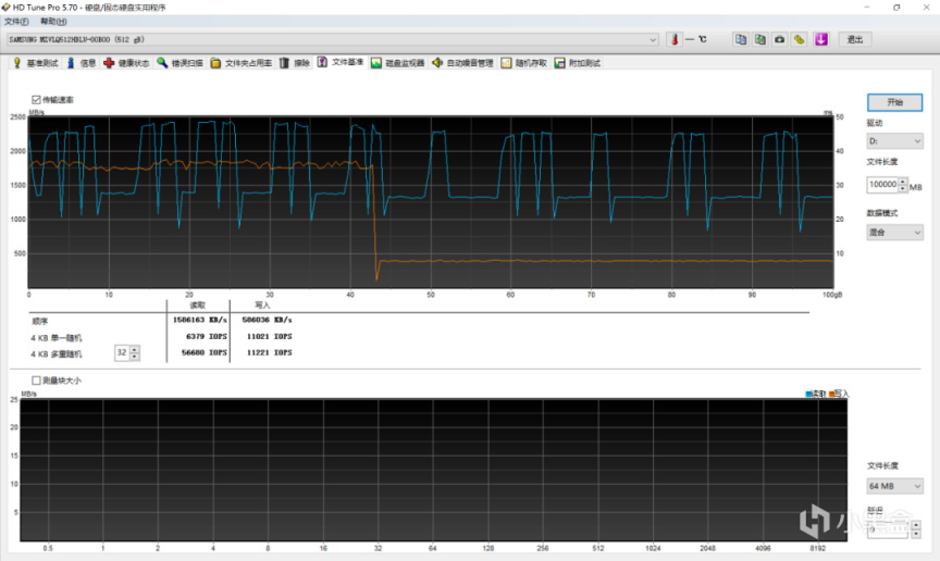連續讀寫42G左右時(SLC Cache容量大約42-43GB)寫入速度大概降至400MB/s左右。對比鎂光2450連續讀寫60G左右時,寫入速度大概降至100MB/s左右,