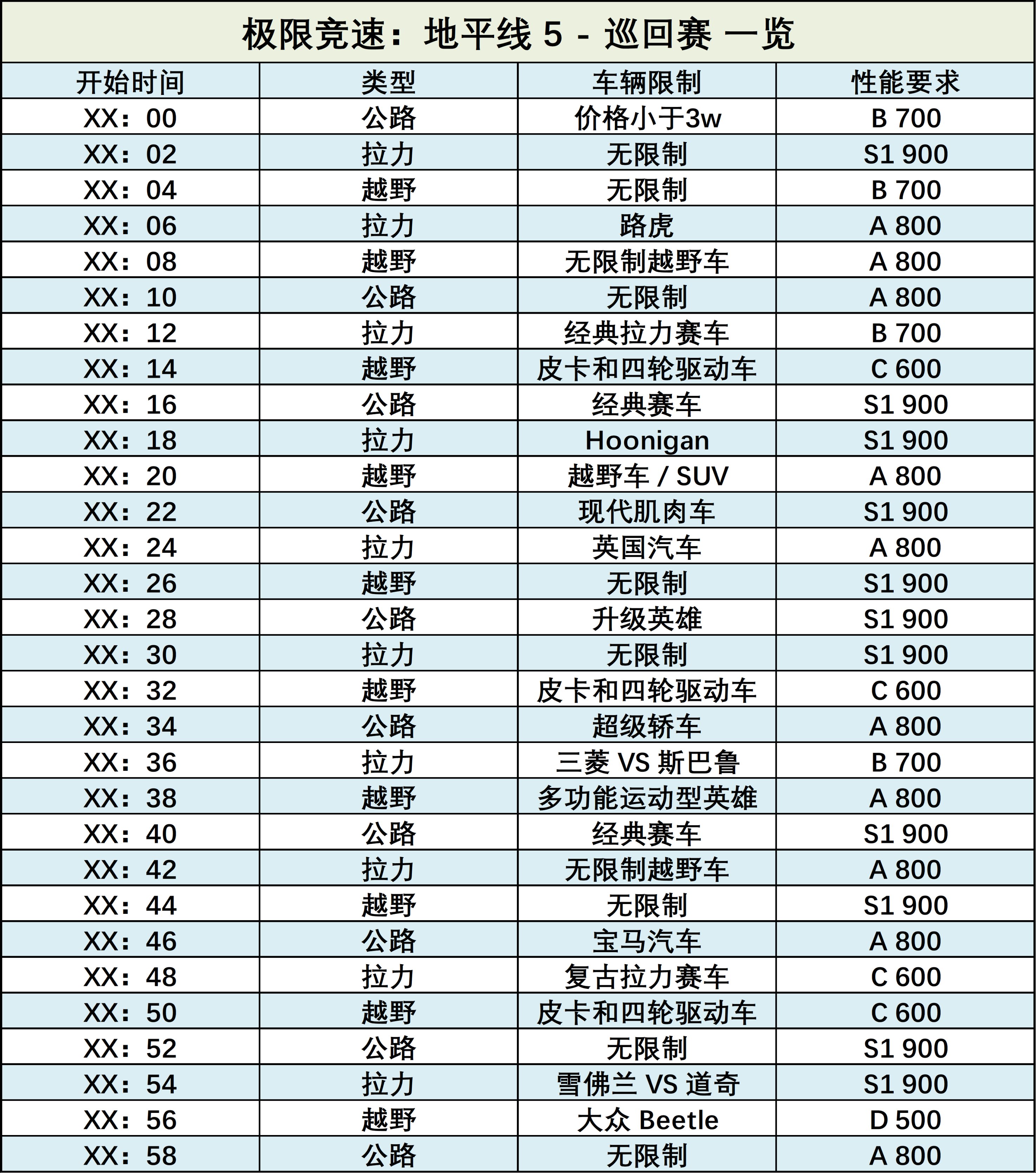 巡迴賽是 PVE 性質的,AI難度略低於所向披靡,每個小時會舉辦 30 場(見上表)。
