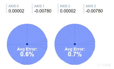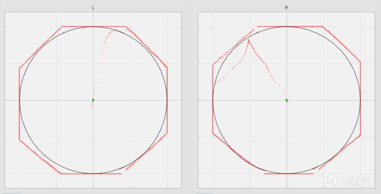 回中測試中這款搖桿的表現略差,能看到兩個搖桿在Y軸的位置明顯比X軸的遠了很多;但在畫圓測試中的表現還算不錯,報錯率僅爲0.6%(搖桿在圓形模式下)。