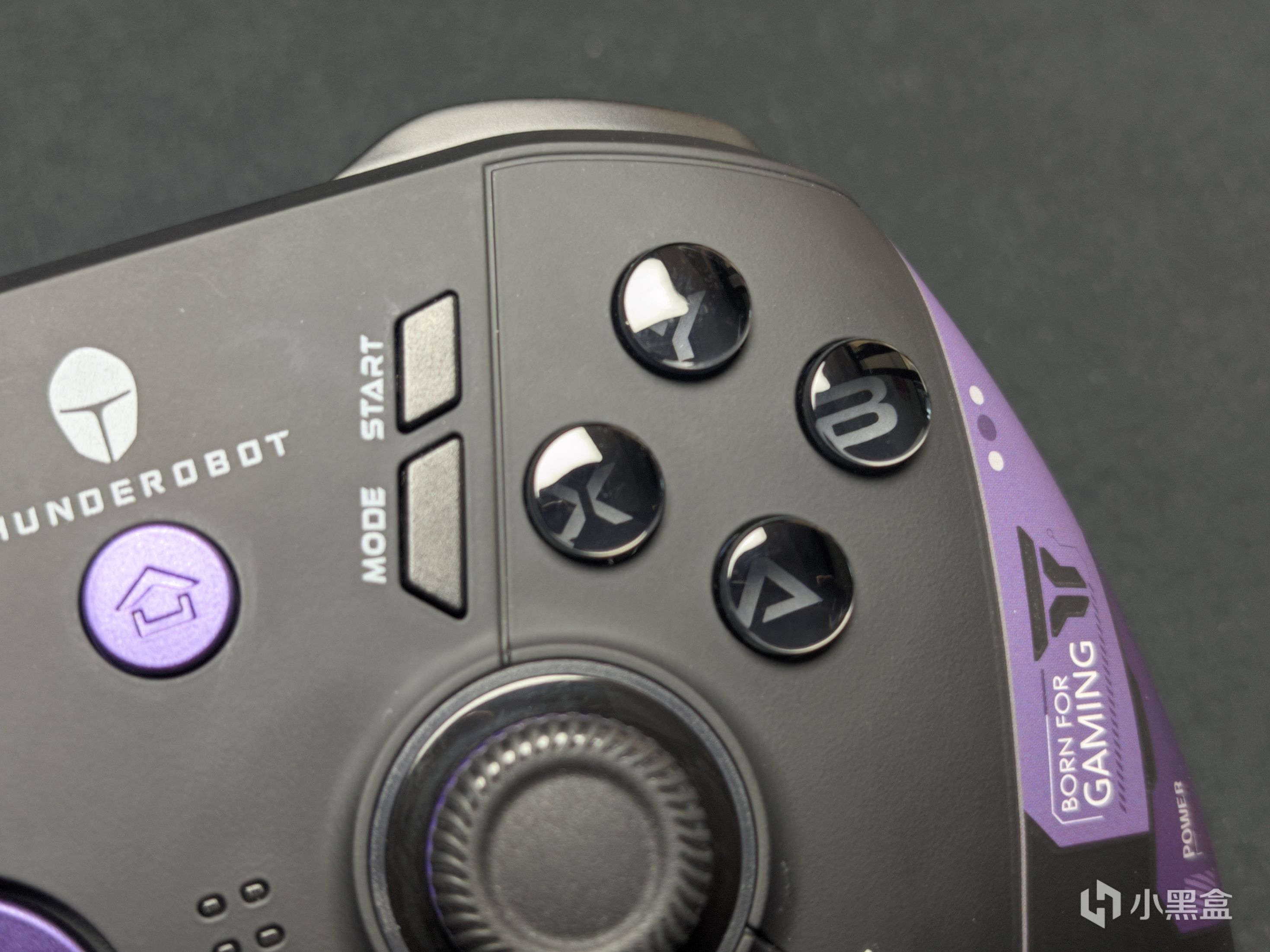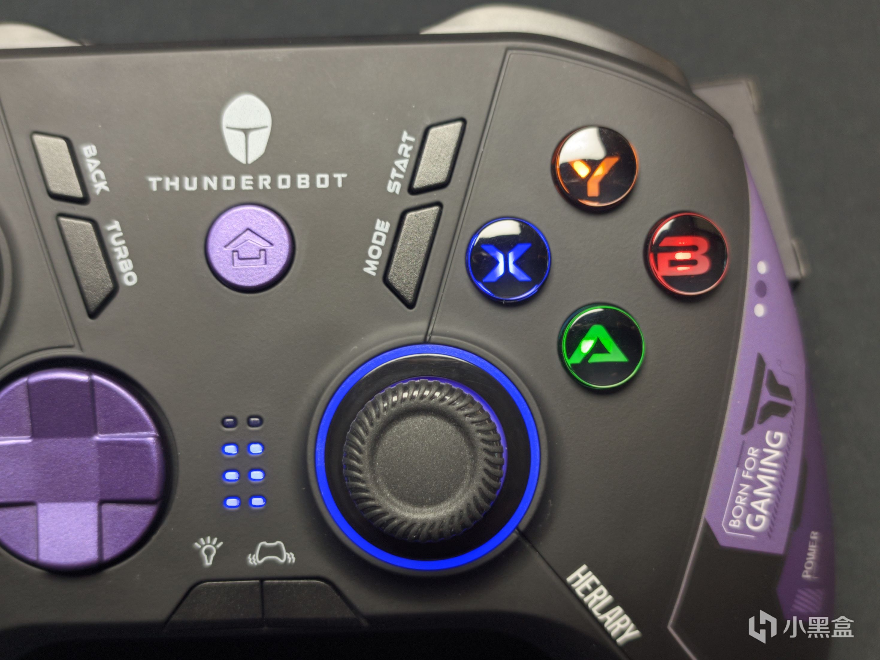 ABXY按鍵選用的是導電膠按鍵,根據雷神所說爲長壽命導膠,對比普通的導電膠來說應該壽命會更長一點。在初拿到手的時候我以爲這四個按鍵是無刻,知道開機後燈光亮起來我纔看到原來字符是隱藏在按鍵下邊,可能在無光狀態下不太好看,但是打開燈光過後這個效果真的帥,四個按鍵保持着不同的燈光效果,不過美中不足的是這些燈光不能夠自定義,比較遺憾。