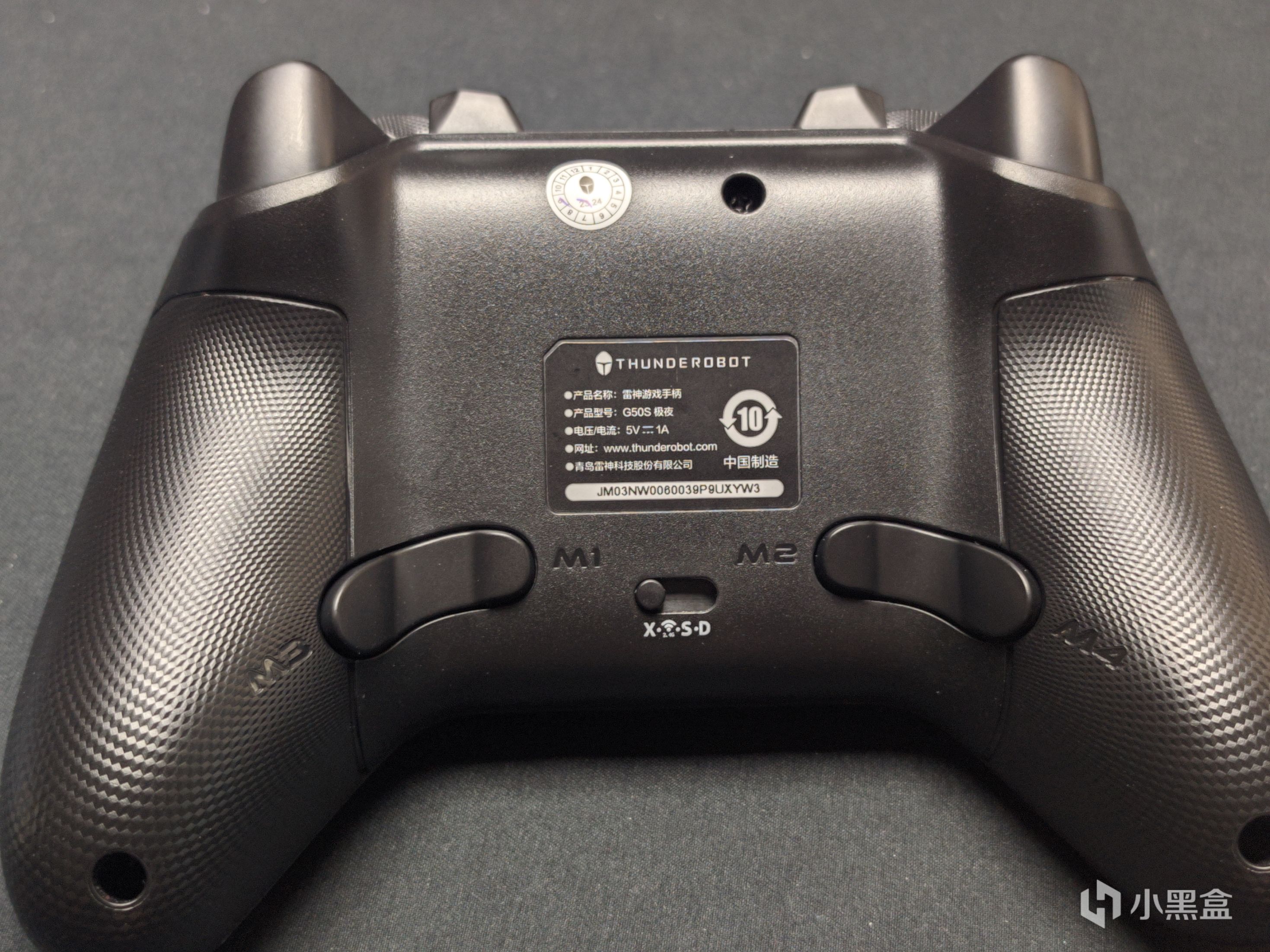 背面能看到中間有一塊貼紙,習以爲常了,下方則是四個背鍵以及模式切換開關,比較有趣的是這四個背鍵,並不是像別的手柄那種四個分開的,而是這種二合一的“兩個”背鍵,至於那種比較好當然還得看個人使用習慣,我個人來說感覺不太適應。
