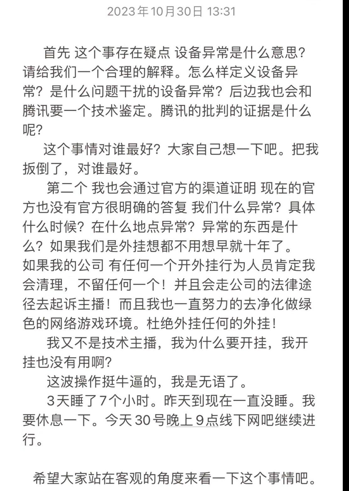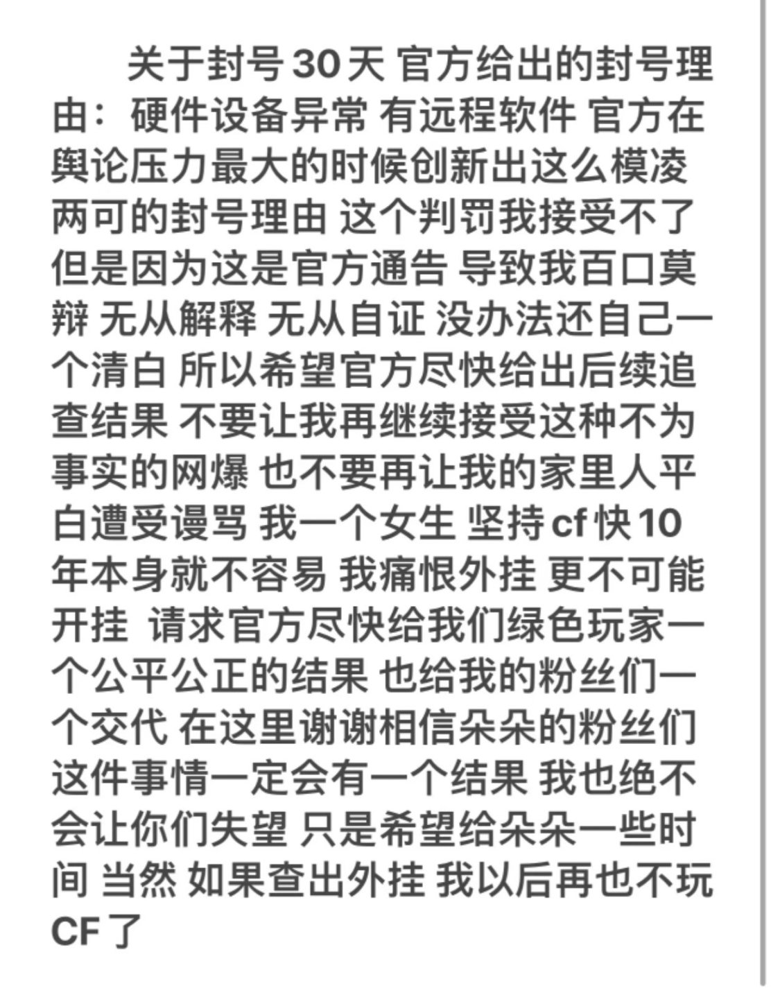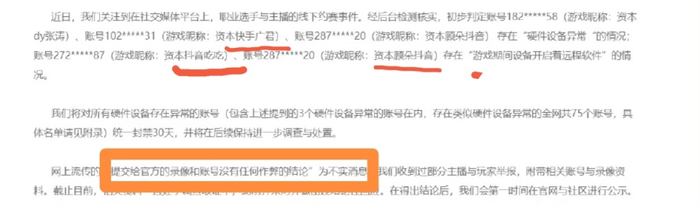 官方將對所有硬件設備存在異常的賬號(包含上述提到的3個硬件設備異常的賬號在內,存在類似硬件設備異常的全網共75個賬號,具體名單請見附錄)統一封禁30天,並將在後續保持進一步調查與處置