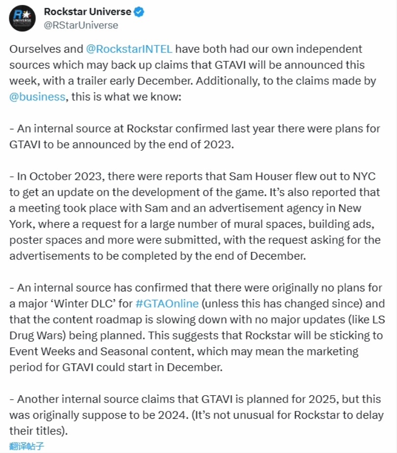 1、R星昨天宣佈GTA6首支預告將於12月發佈。儘管玩家期待已久,但仍然需再等一陣子。消息來源@RStarUniverse及@RockstarINTEL表示,GTA6原本將於24年發佈,但現在已經被推遲到25年,R星推遲遊戲發售時間是常規操作,此前也曾將《大表哥2》等進行延期。