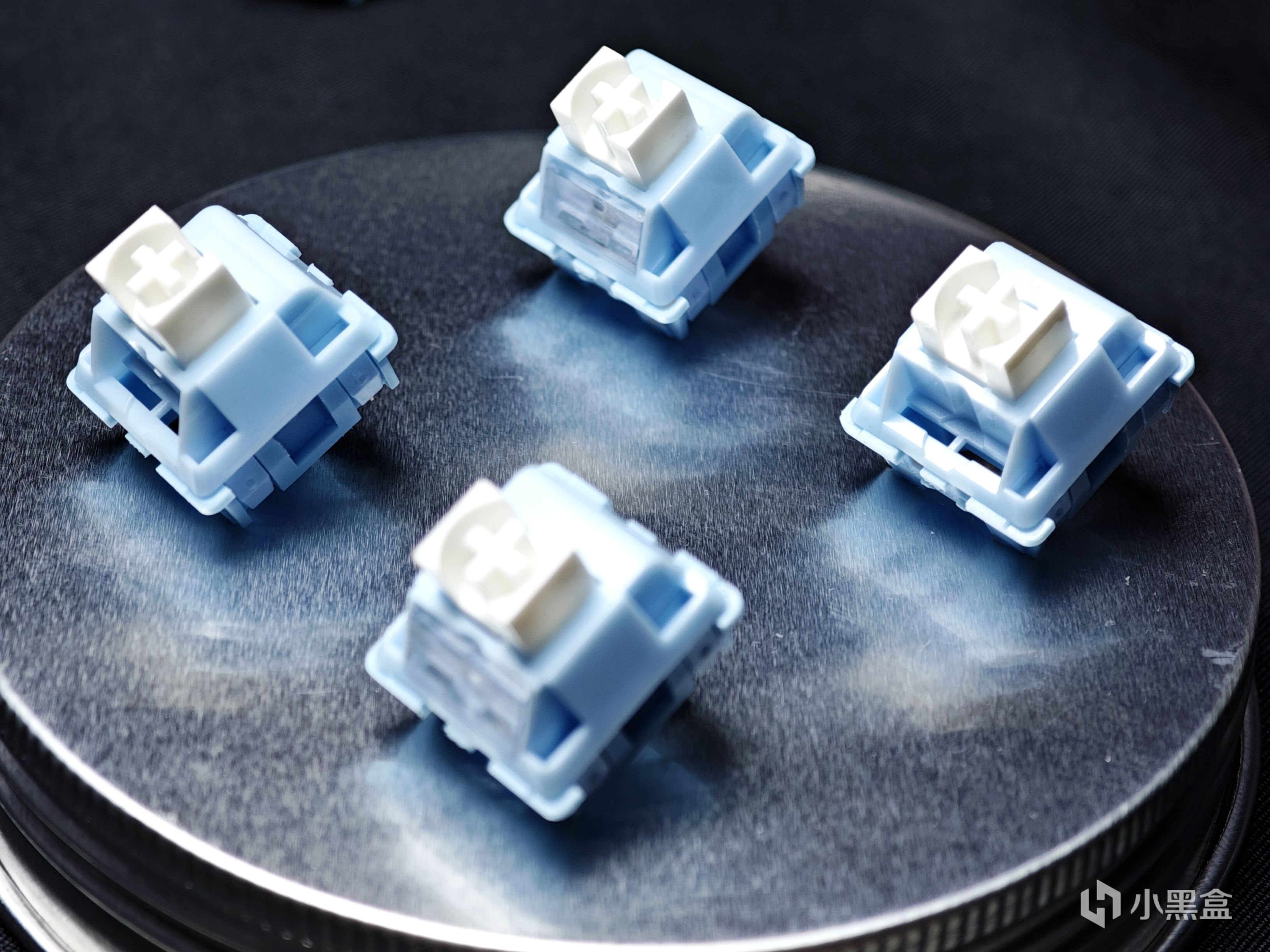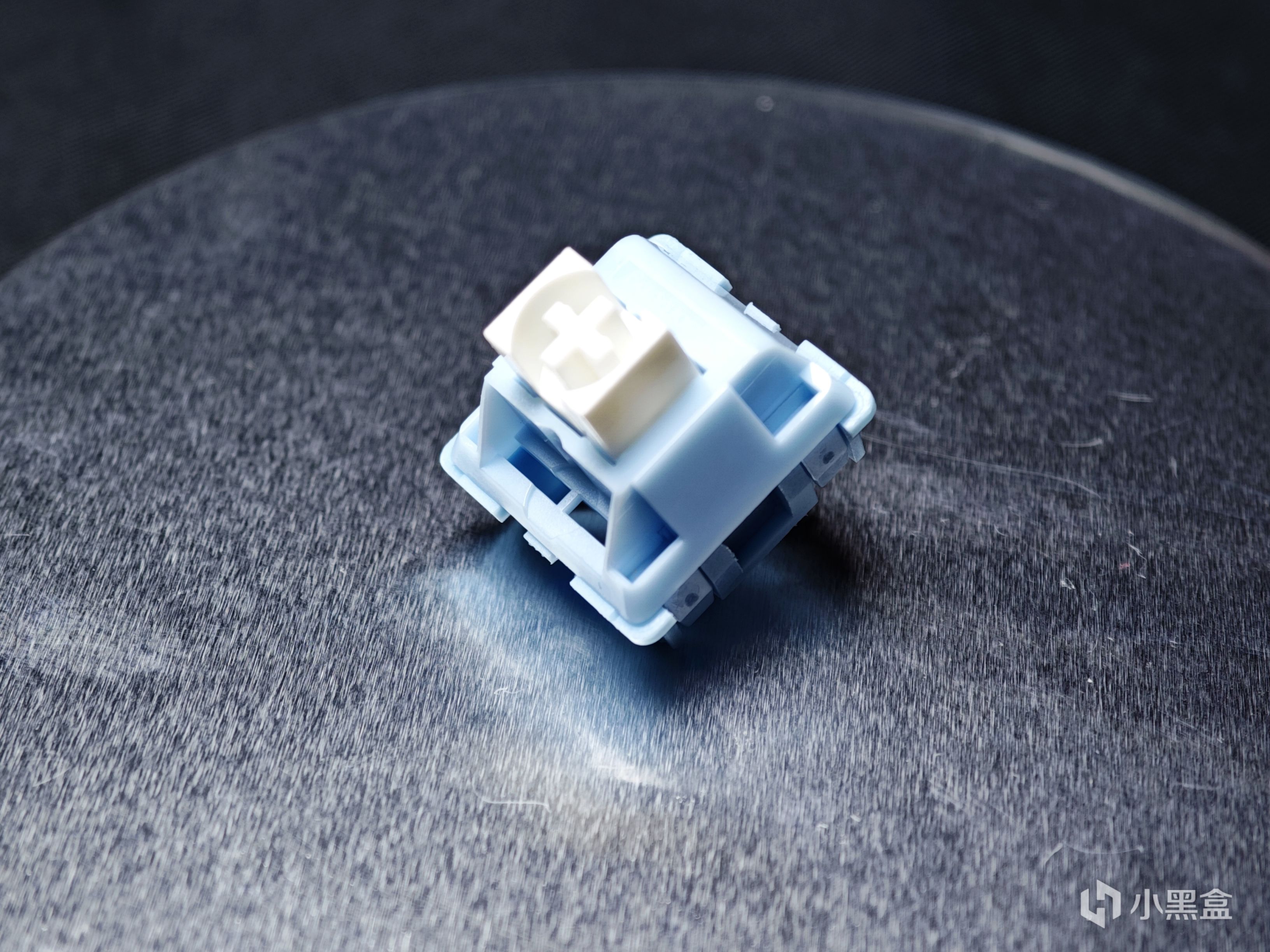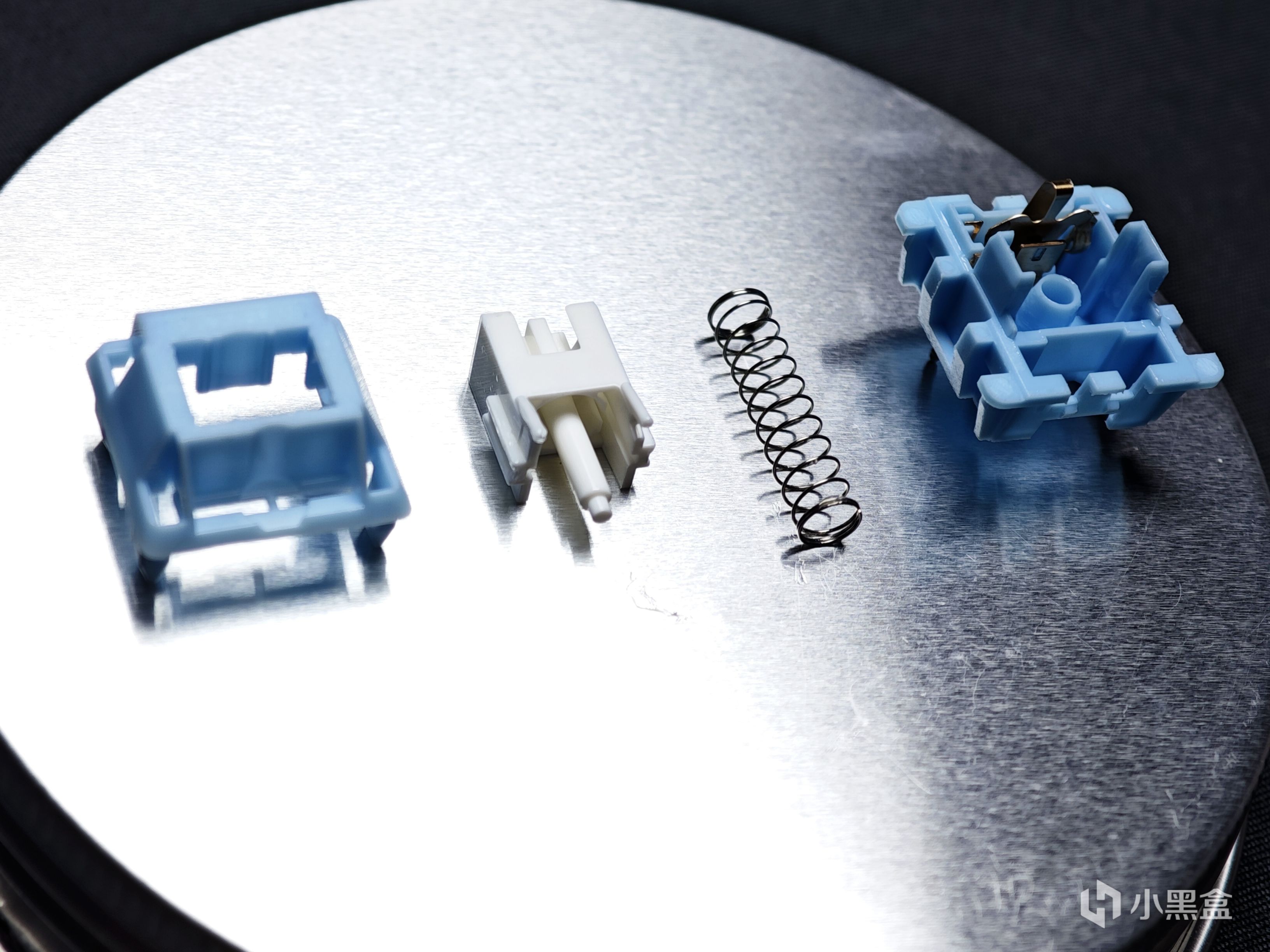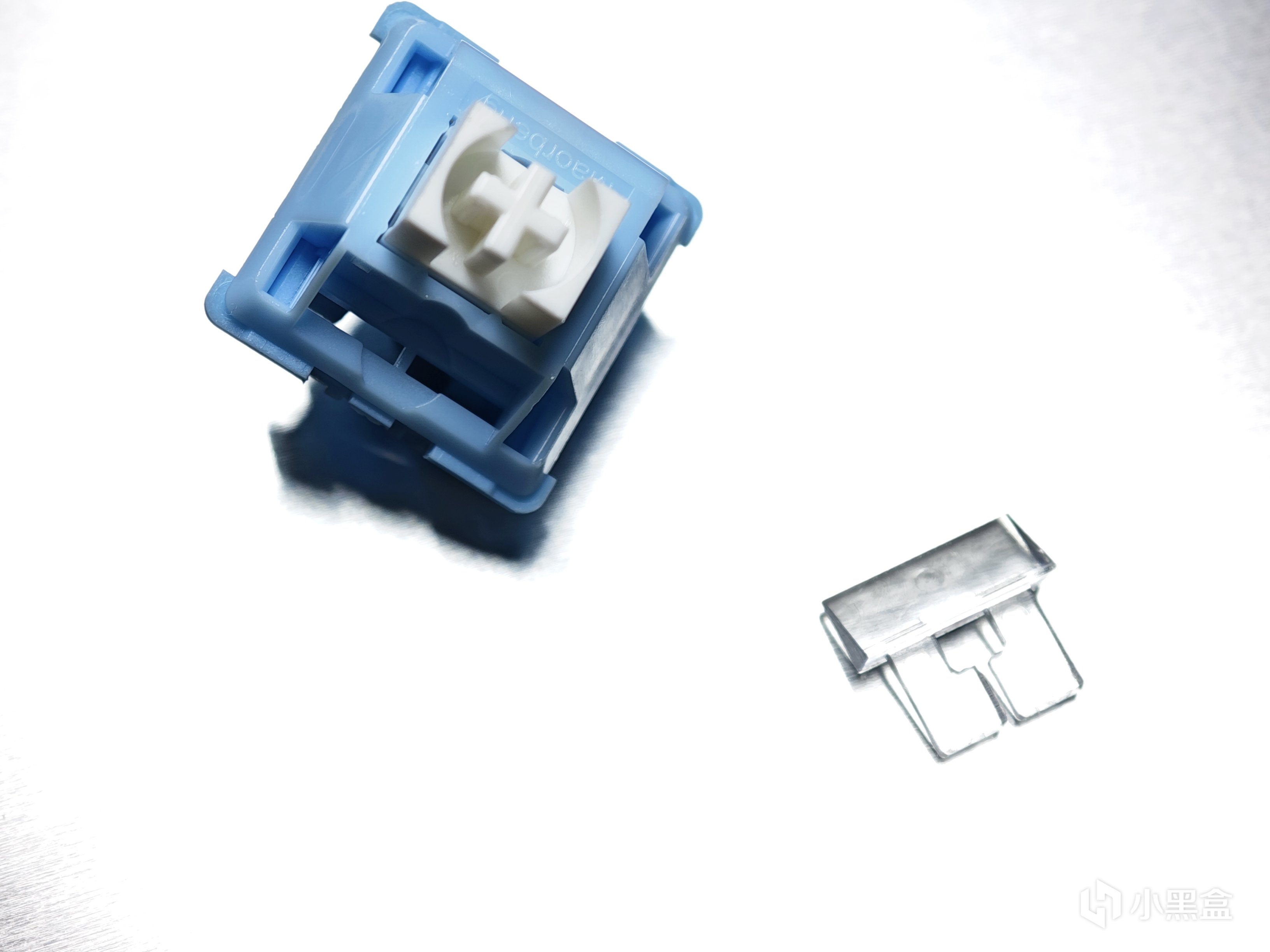 第二款軸體是貓爾本的玉桂軸,是本期文章裏價格最便宜的軸體,僅有1元/顆,但配置上卻不含糊,採用的是實色PC上蓋+尼龍PA66底殼+POM軸芯的配置。整體的顏色也很討喜,淡藍色的外殼配上白色的軸芯,外觀顏值很不錯。