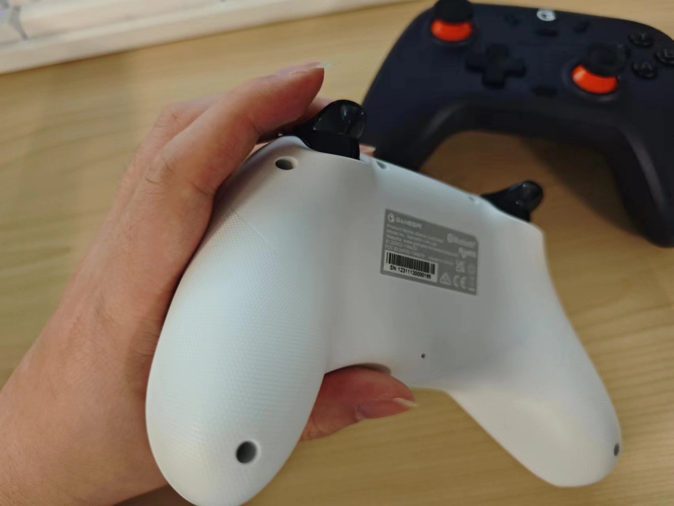 按鍵佈局是XBOX佈局。表面是磨砂感,摸起來的感覺有點像PS4手柄。只有兩端的下面一點有防滑處理,感覺少了些。