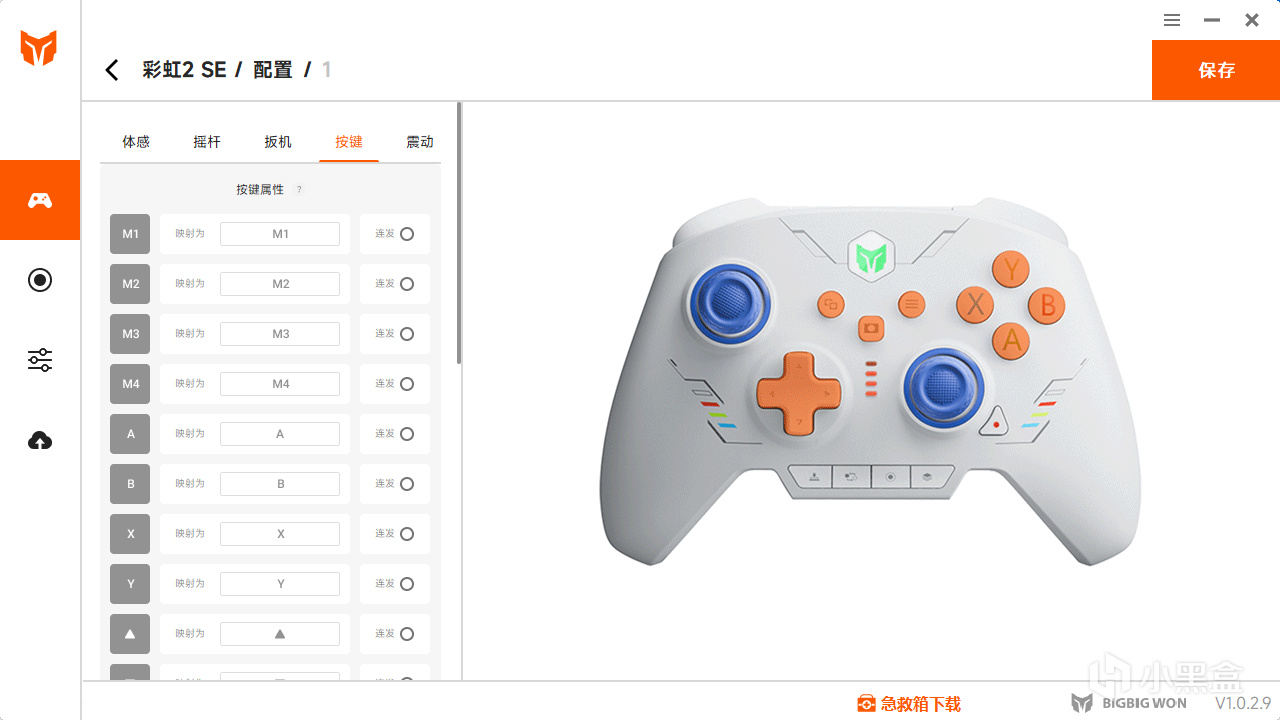 有PC端工具,並且現在PC端工具應該也是支持了彩虹2 Pro,雖然很多功能可以通過組合鍵實現,但是有了工具,大家實現一些功能就更簡單了,比如連發、體感、映射、宏錄製等一些內容,而且有一部分功能是必須要通過PC端工具才能實現的,就比如我後面會提到的搖桿外圈切換,這個在說明書中是沒有提及的,再比如無死區模式,這個也是需要PC端工具的,再有就是震動調節和自定義搖桿步進值等等一些內容。